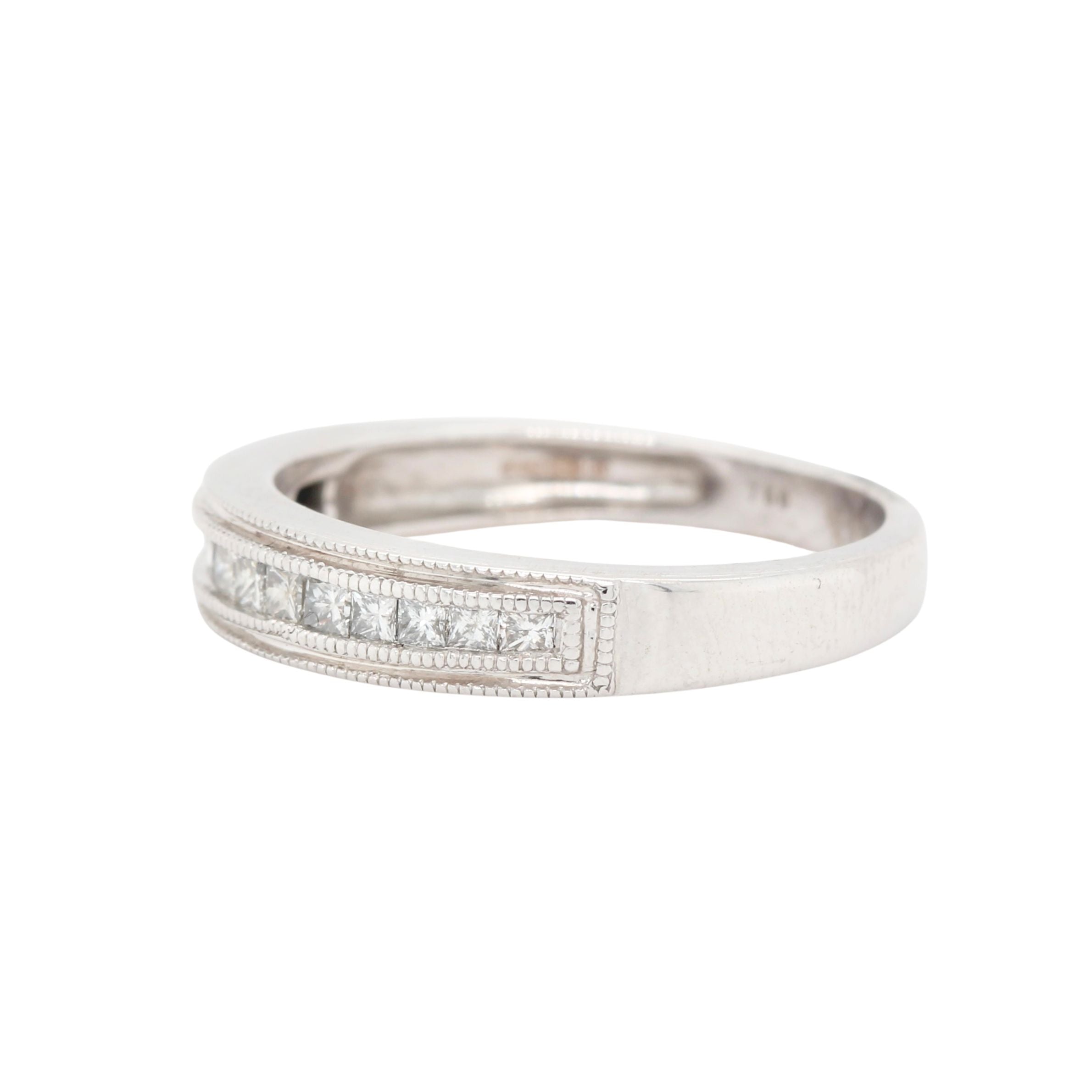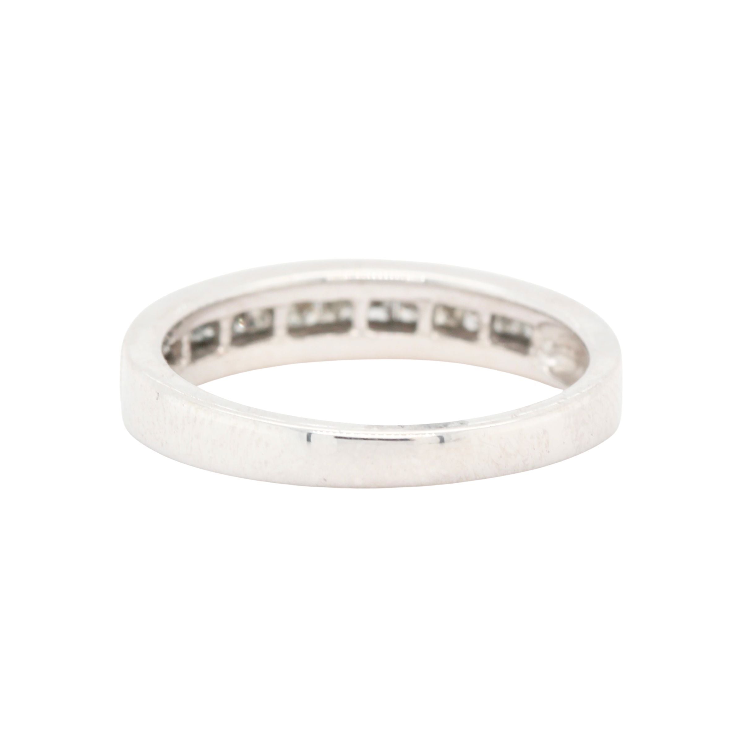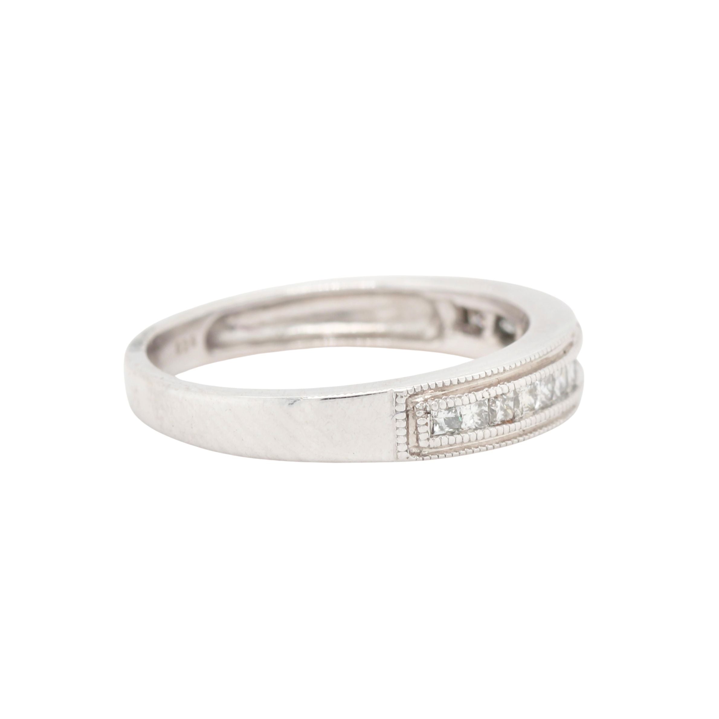 A vintage diamond half-eternity ring, crafted in 18ct white gold. The ring is set with square-cut diamonds totalling approximately 0.25 carats, arranged in a refined channel setting with delicate millegrain detailing. The interior of the shank is marked 750, with the maker’s mark SC and 0.25. Dating to circa 1990.