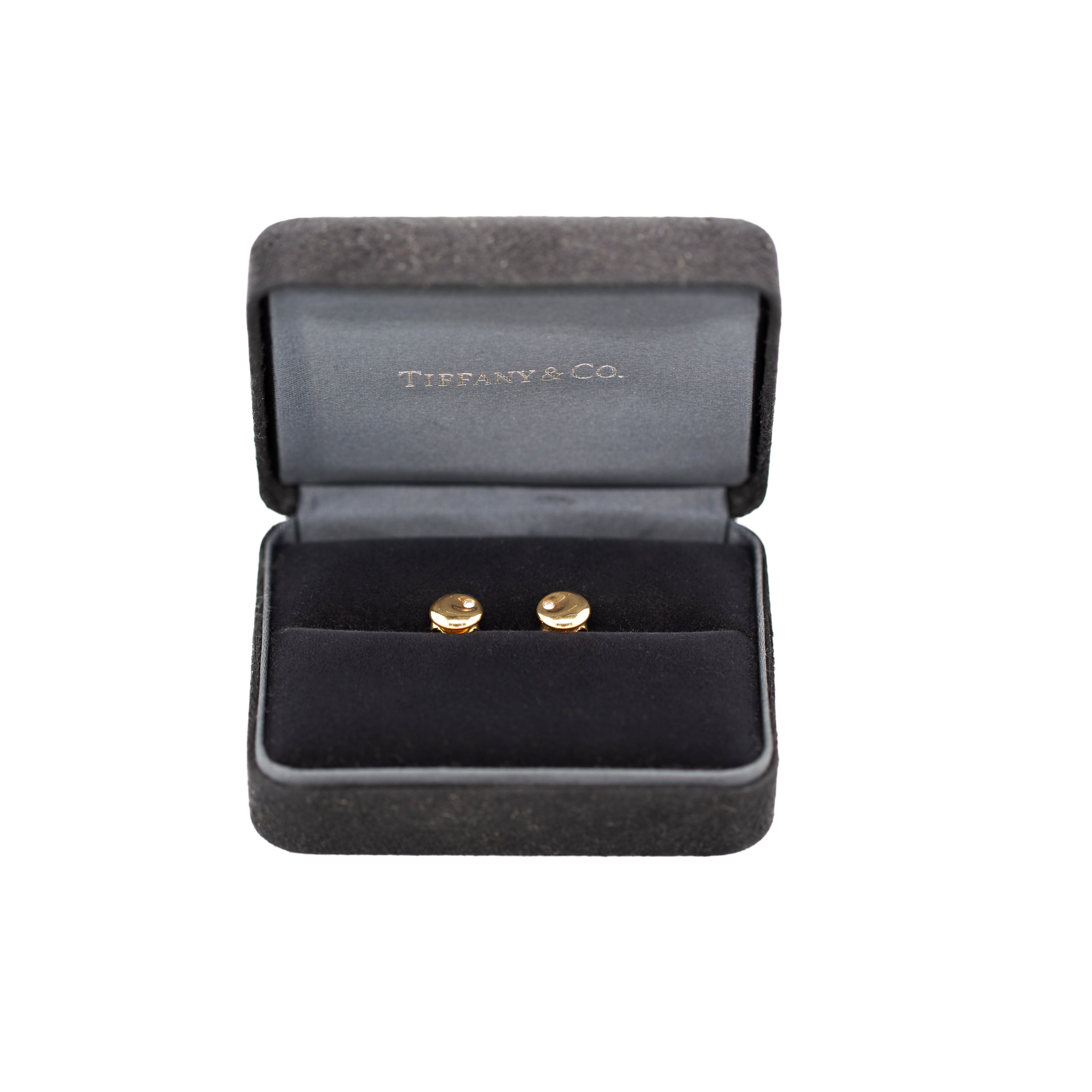 A pristine pair of Elsa Peretti for Tiffany & Co. 18ct gold and diamond stud earrings, circa 1990. Each dished gold stud is set with a sparkling 3-point diamond. Designed by Elsa Peretti, whose organic, sculptural style helped redefine modern jewellery, they come beautifully preserved in their original Tiffany box.