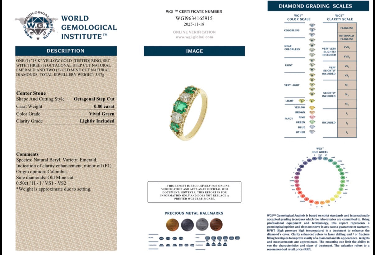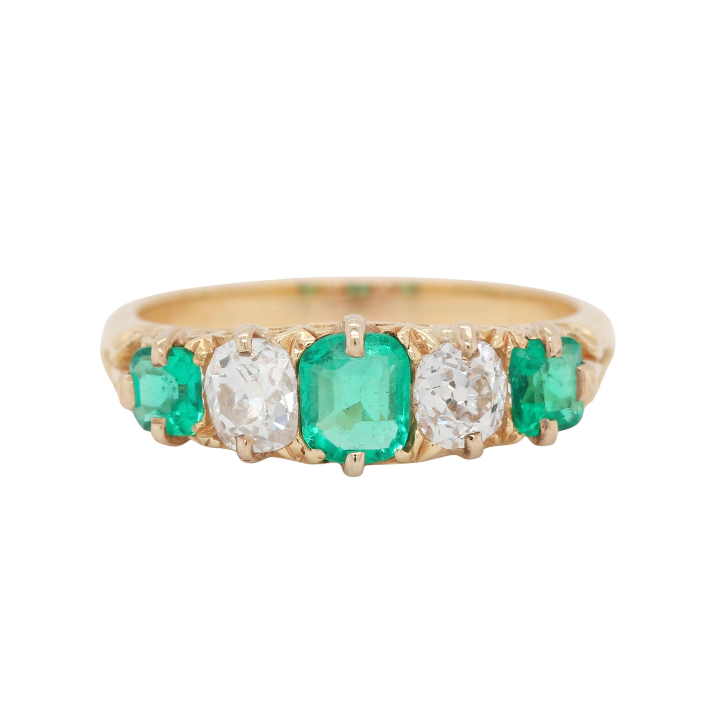 A striking five-stone ring set with Colombian emeralds and old mine-cut diamonds, mounted in an engraved 18ct gold setting, circa 1950. The three emeralds have a combined estimated weight of approximately 0.80 carats and show minor oil enhancement. They are flanked by two old mine-cut diamonds of approximately 0.25 carats each, assessed as H–I colour with VS clarity. Fully certified by WGI.
