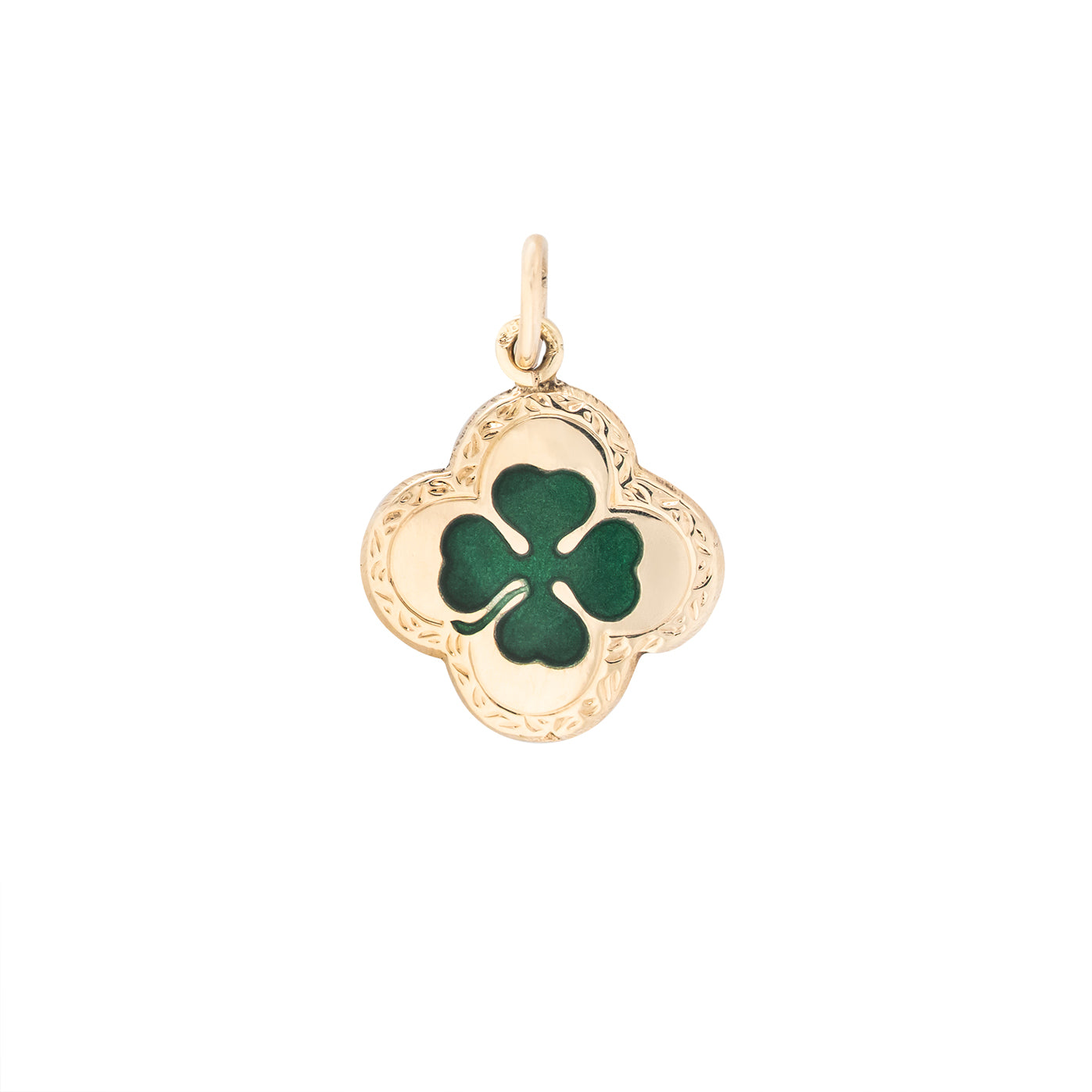 A 14ct gold green enamel four leaf clover pendant/charm. This pretty piece is set in a quatrefoil shape, the outside edge engraved. Circa 1930