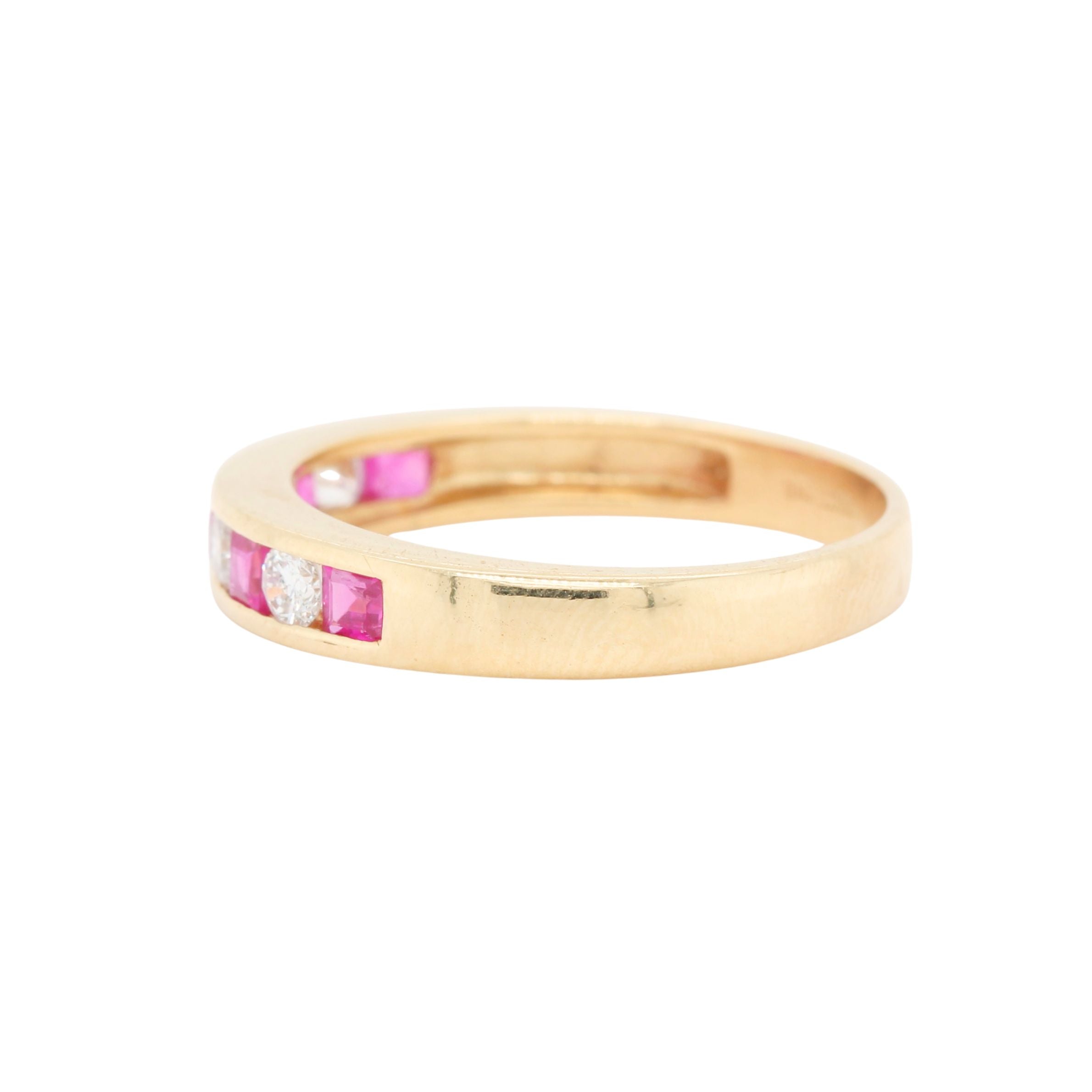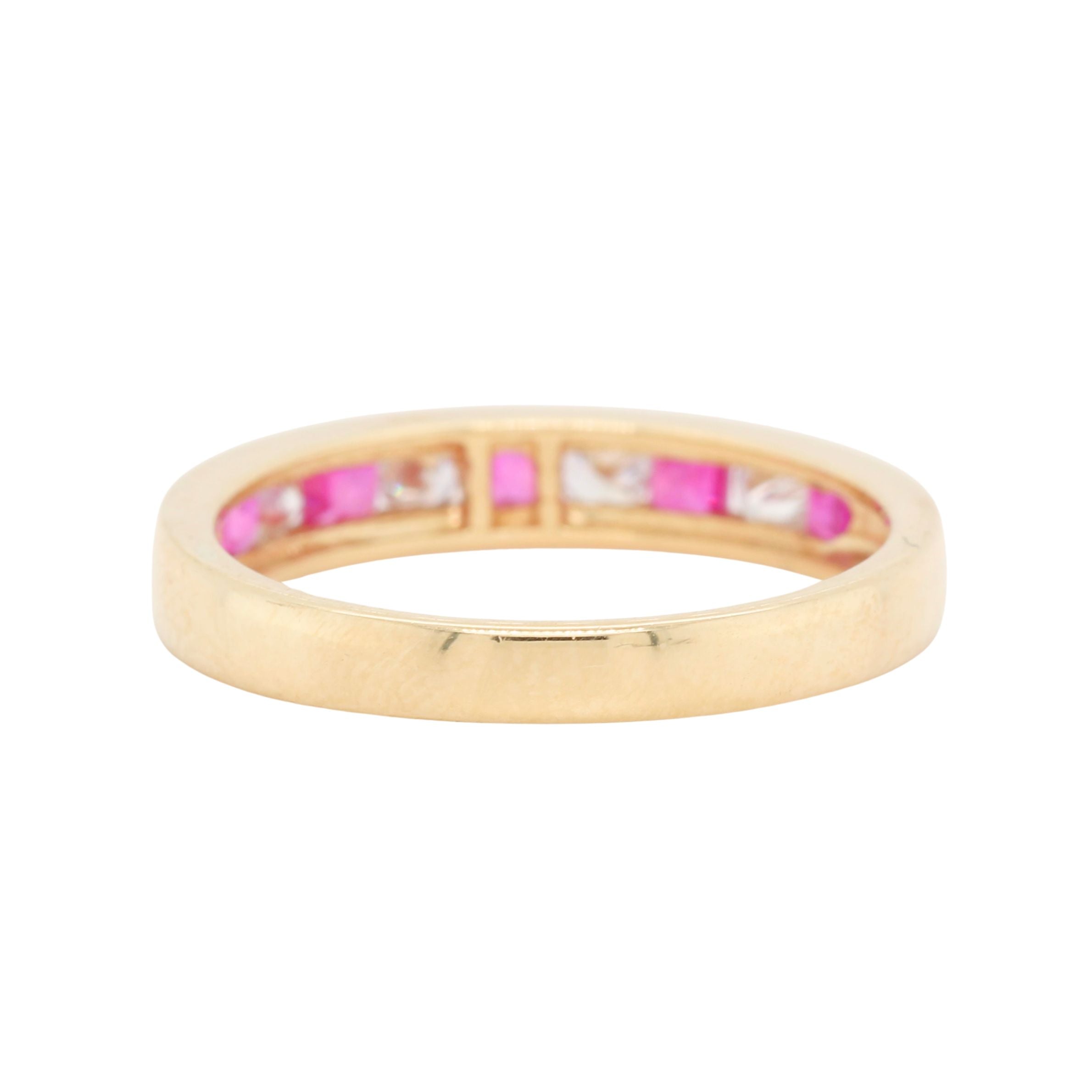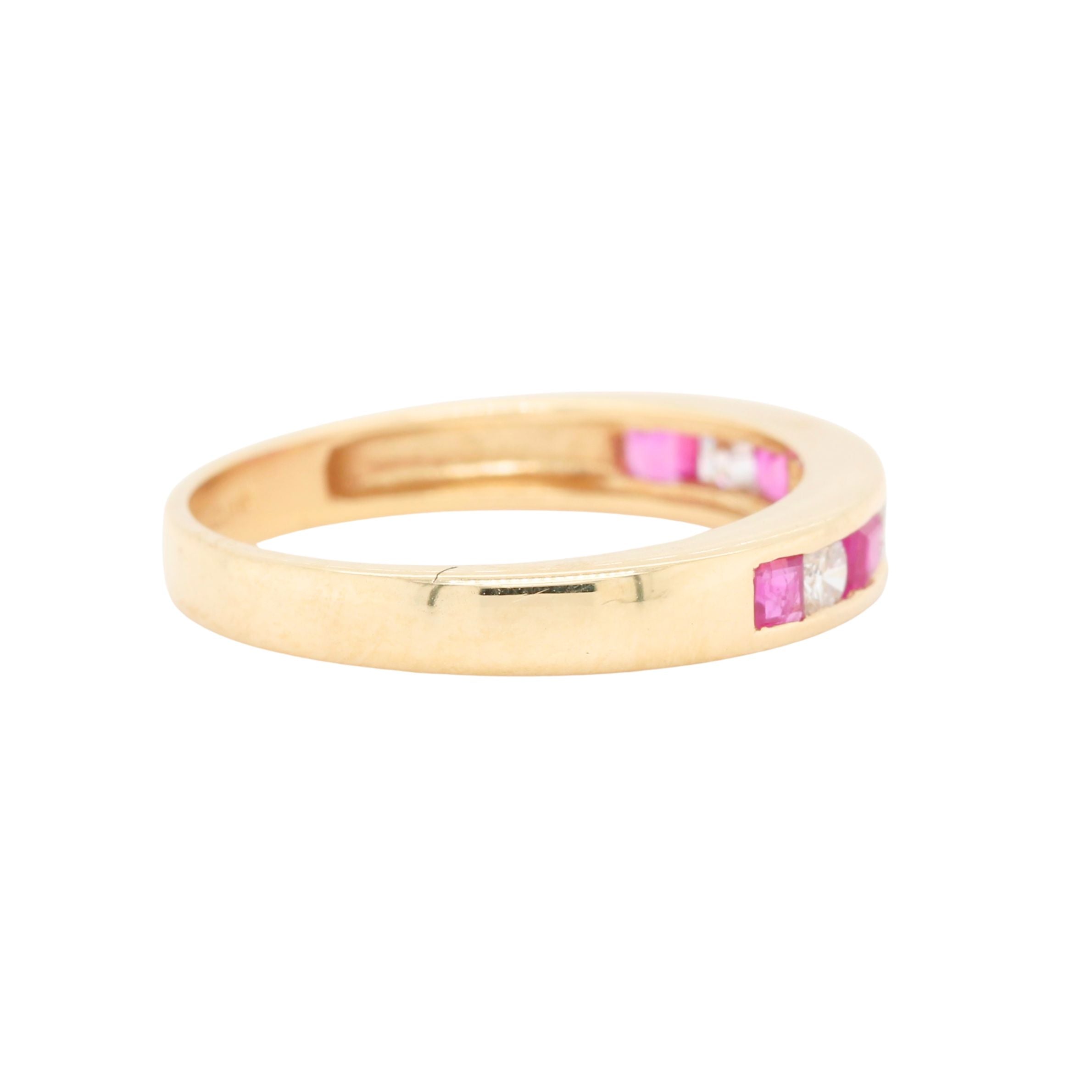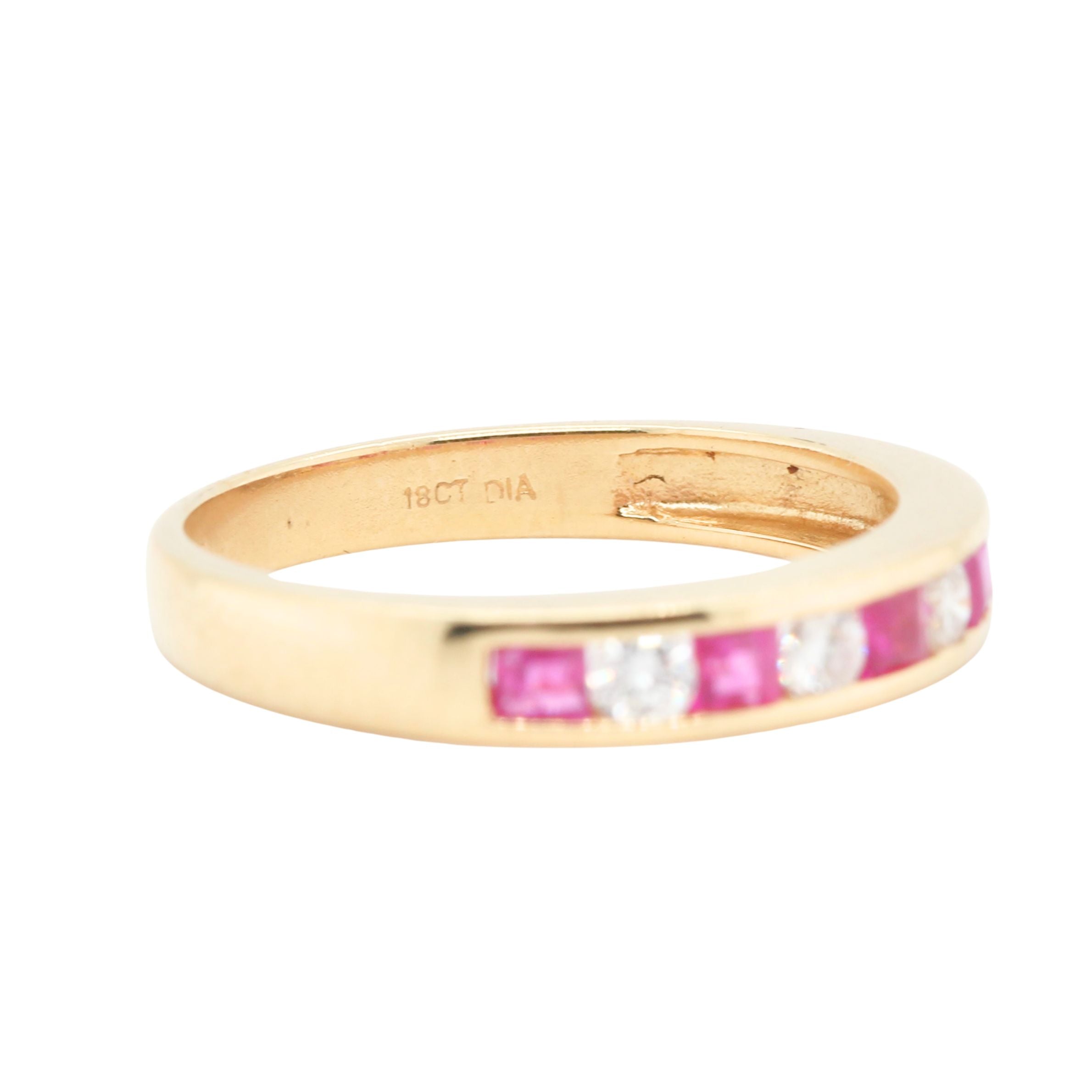 A vintage ruby and diamond half-eternity ring, set in 18ct gold. Alternating square-cut rubies and brilliant-cut diamonds are channel-set to form a sleek, balanced band with strong colour contrast and sparkle. The interior of the shank is marked 750, LB Ltd, and DIA 18ct. Dating to circa 1990.