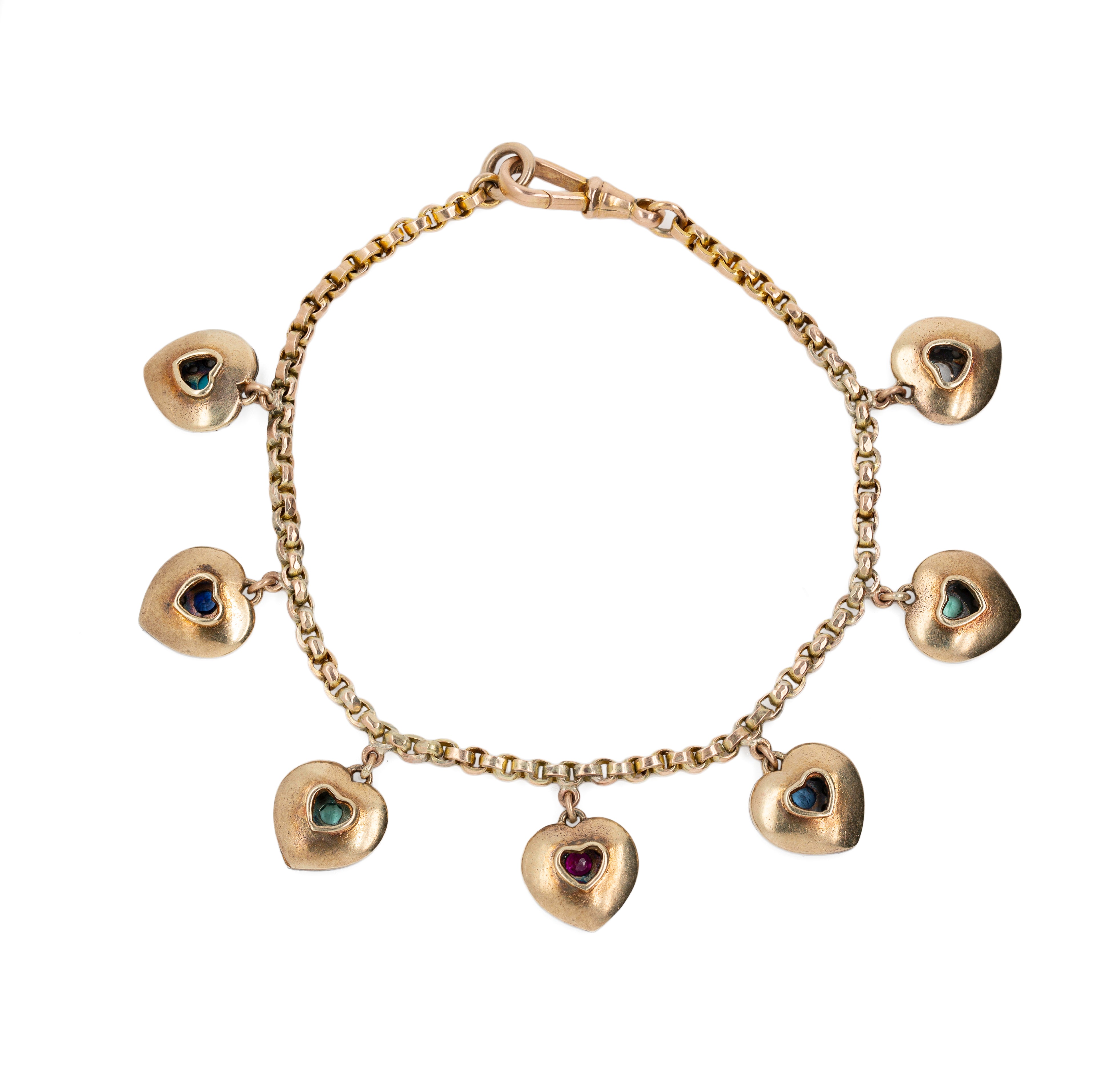 A Victorian acrostic bracelet, composed of a belcher link chain suspending seven heart-shaped charm pendants pavé-set with rose-cut diamonds and respectively centred with a diamond, emerald, amethyst, ruby, emerald, sapphire and turquoise, the initials of the gems spelling out the word 'DEAREST', a coded declaration of affection that was especially beloved in the 19th century.