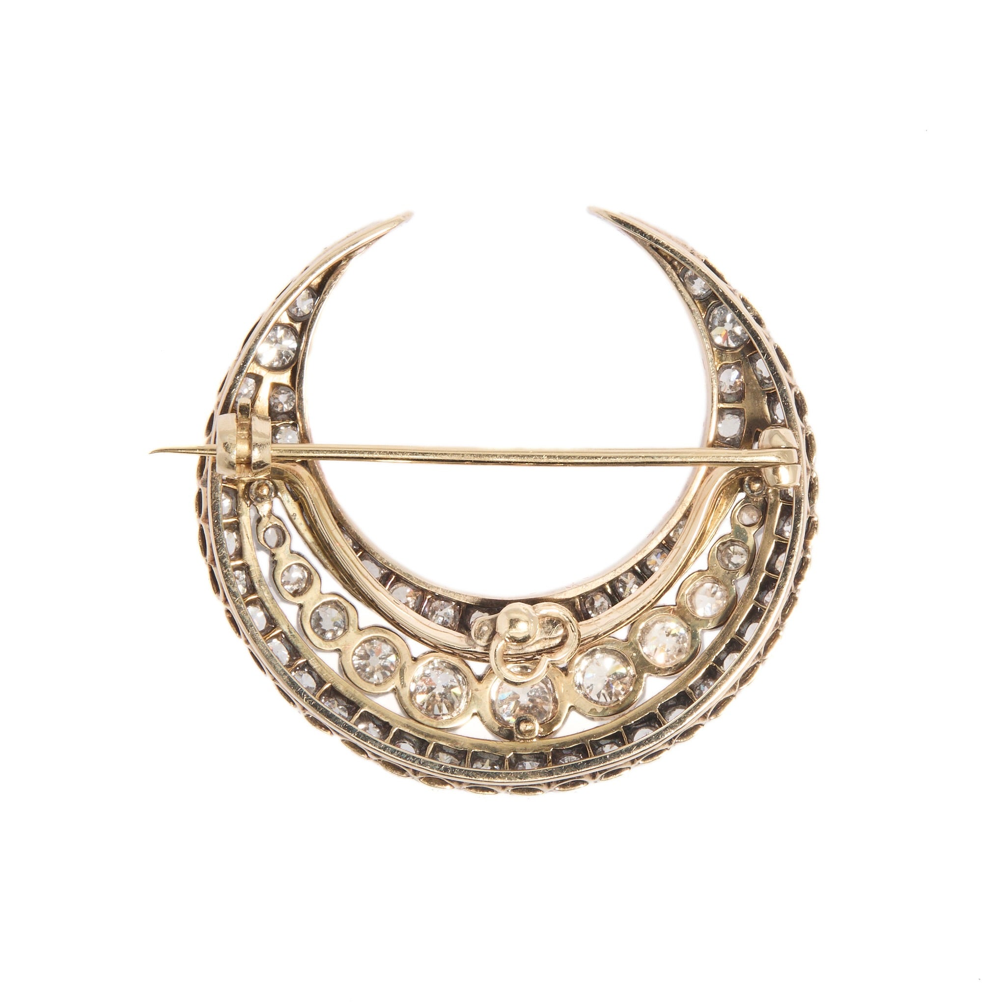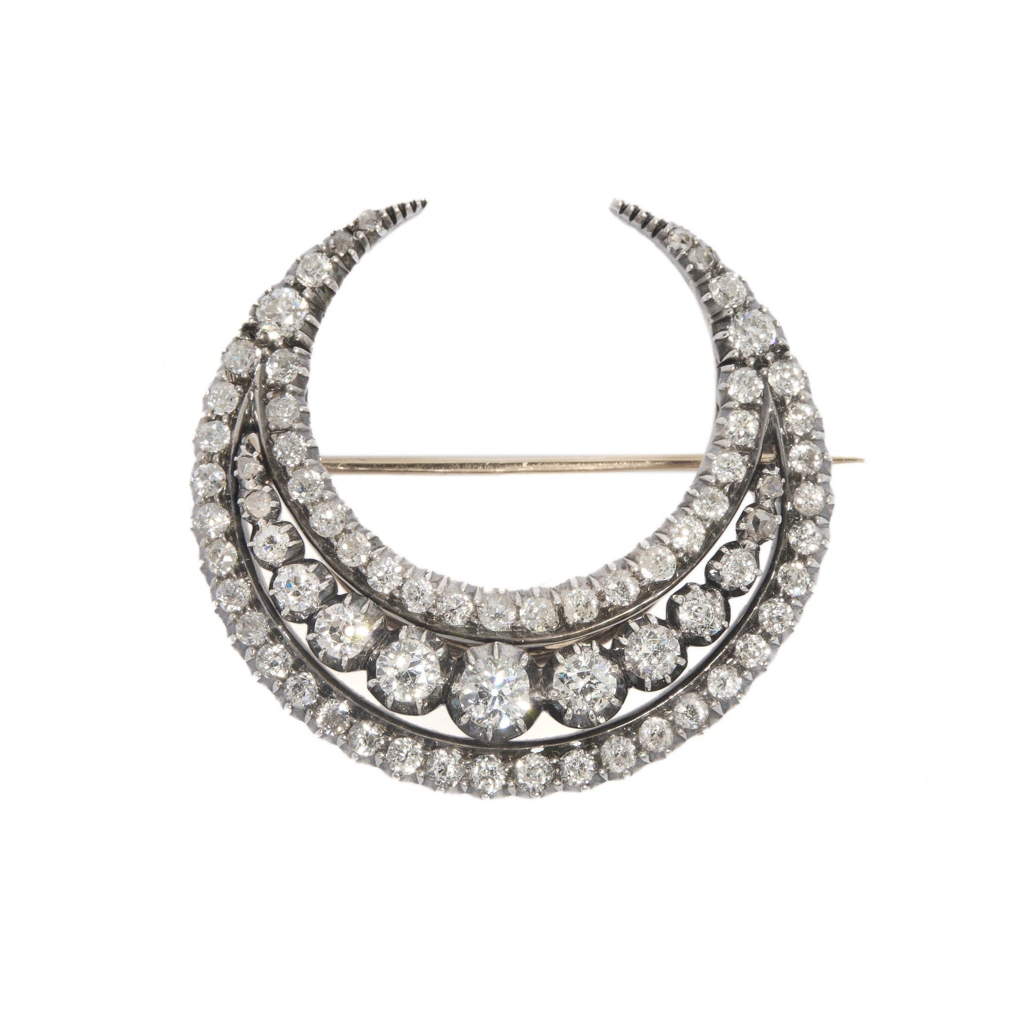 A magnificent late 19th-century diamond crescent brooch, designed as a bold double crescent and set throughout with shimmering old European-cut diamonds. Mounted in silver over 18ct gold, the brooch has a total diamond weight of approximately 4.05 carats of I-colour, VS-clarity stone.