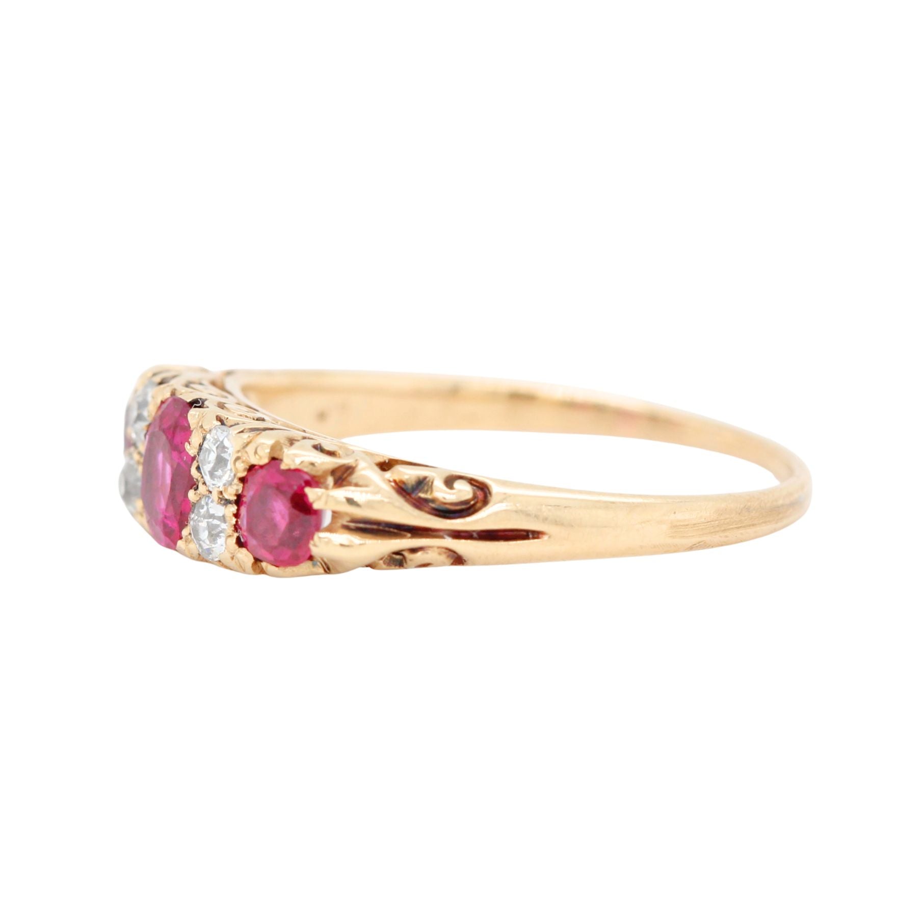 A beautiful Victorian era ring crafted in 18ct yellow gold. Featuring a rubies and old European cut diamonds, with an engraved and pierced out gallery circa 1870. Two of the rubies are Burmese and one of the side rubies is Thai but they match very well. The ring is marked C&S Co 18 inside the shank.