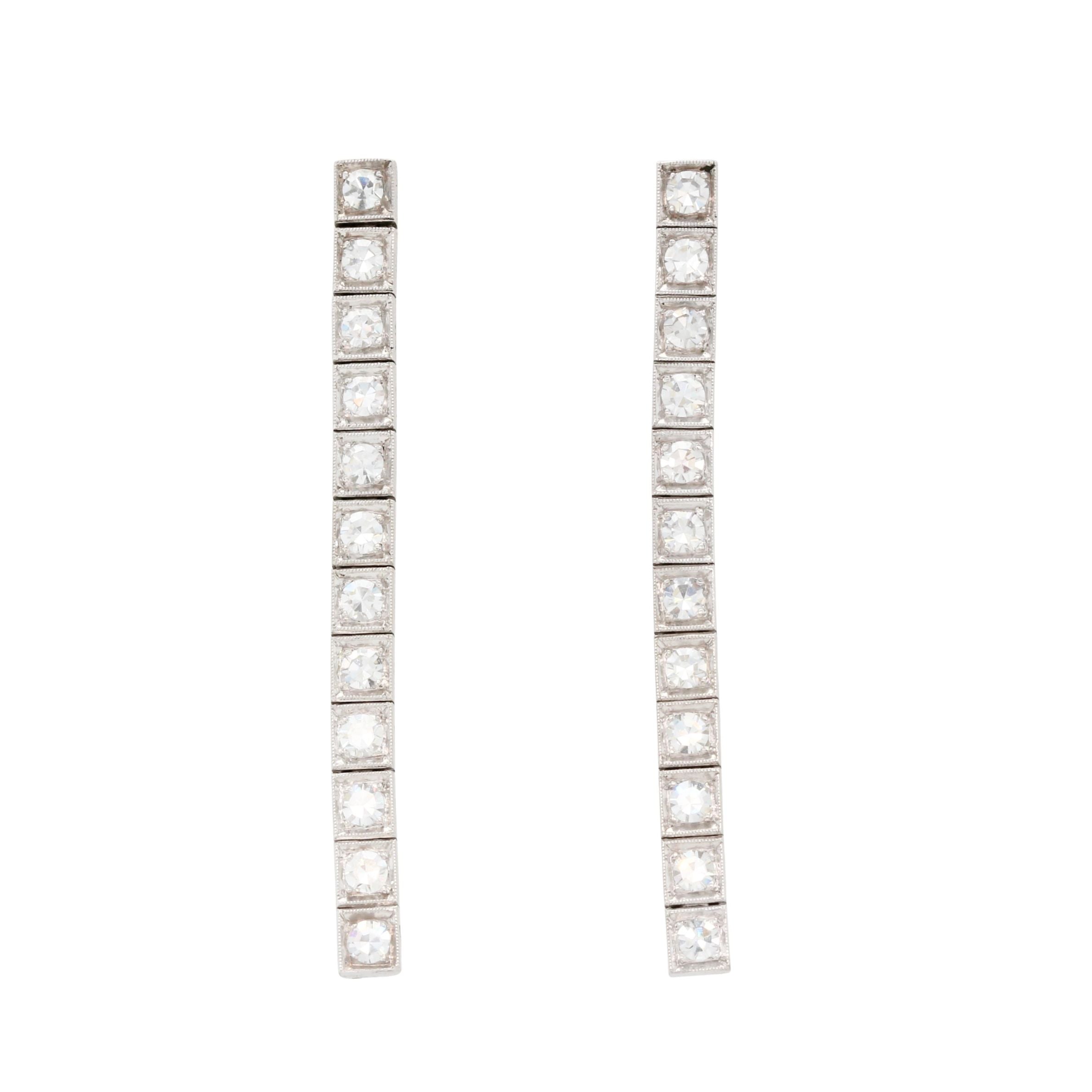 very elegant pair of Art Deco earrings, dating to circa 1920, crafted in platinum. Each earring is composed of a vertical line of twelve eight-cut diamonds, individually set within finely milgrained box settings. The articulated construction allows for delicate movement, catching and reflecting the light when worn. The diamonds are well matched, estimated to weigh approximately 1.20 carats in total, assessed as G–H colour and VS clarity. The refined linear design and subtle articulation are characteristic of the Art Deco period, combining geometric precision with graceful movement.