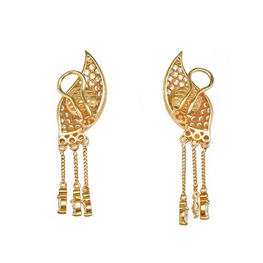 The most stunning pair of Vintage diamond leaf earrings. These earrings are formed of brilliant cut diamonds and are set in 18ct gold, with clip fittings and three drops. Set with approximately 2.5 carats of diamonds in each earring. Circa 1990