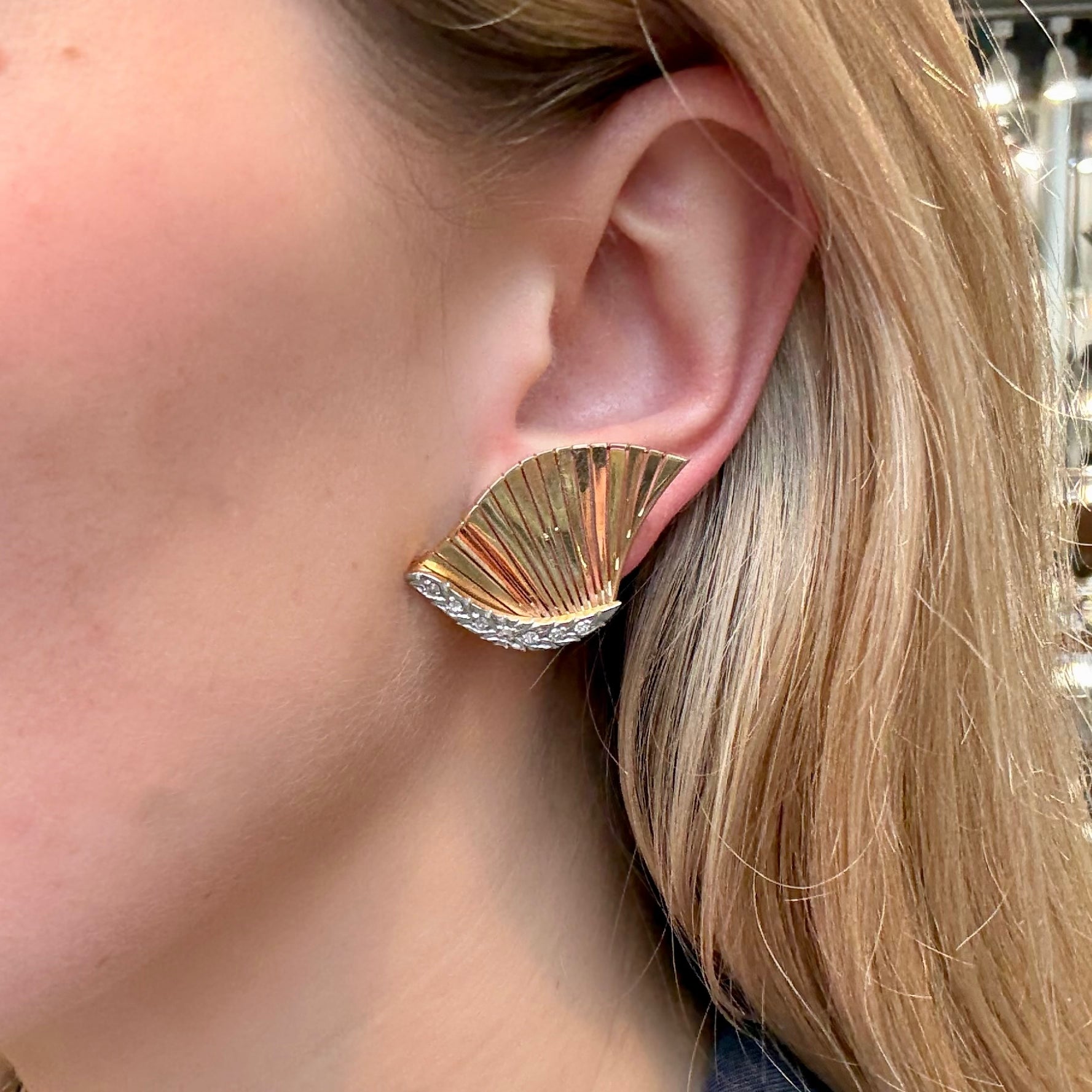 18ct gold and diamond 1940s wave/fan-shaped earrings with post and clip fittings and stamped 18ct. The diamonds are set in a platinum leaf detail setting.