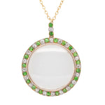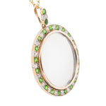 A refined and elegant demantoid garnet and diamond pendant. Crafted in 18ct gold and platinum. Surrounding the centre is a delicate halo of alternating demantoid garnets and diamonds. The bail is finished with a simple arrangement of matching stones. Suspended from a 9ct gold chain.