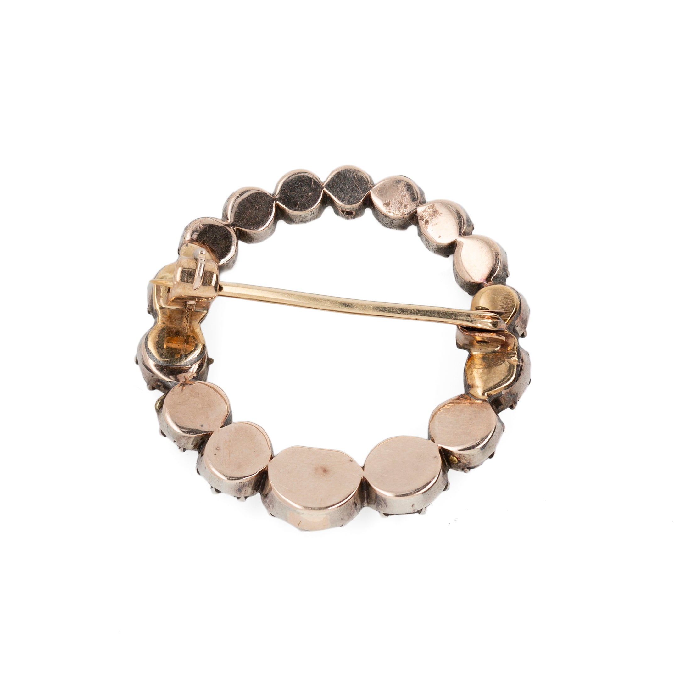This striking Georgian circular brooch is set with a graduated row of rose-cut diamonds, totalling approximately 4.75 carats. The rose cuts show the appealing irregularities and soft sparkle associated with early hand-cut diamonds. The open circular design gives the piece a light, classic look, and the original pin fitting remains intact. Crafted in silver and 18ct gold. If preferred, the brooch could be converted neatly into a pendant, as its balanced shape lends itself well to adaptation.