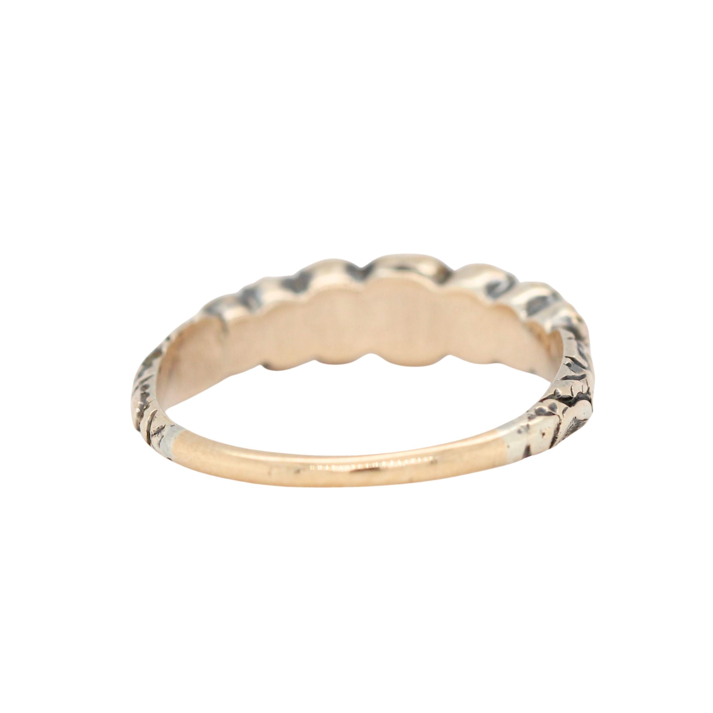 Georgian seven-stone ruby line ring, dating from circa 1780–1800. Crafted in 18ct gold, the ring features a finely chased shank and a row of foil-backed natural rubies, totalling approximately 1.35 carats. The rubies are unheated, enhancing their rarity and desirability.