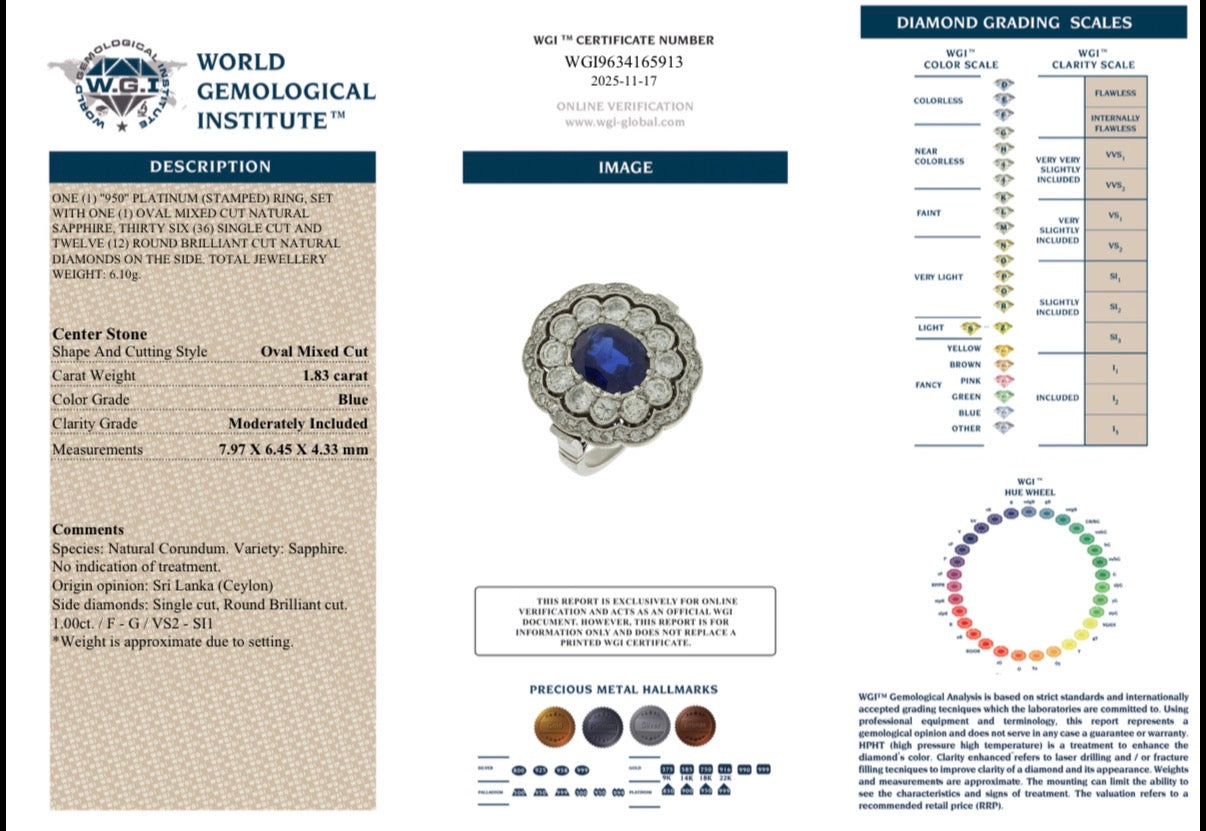 A very pretty Sri Lankan sapphire and diamond cluster ring crafted in platinum circa 2000. The central sapphire is approximately 1.83 carats with a surround of brilliant cut diamonds, approximately 1 carat in total. F-G colour and VS2 - SI1. Fully certified by WGI.