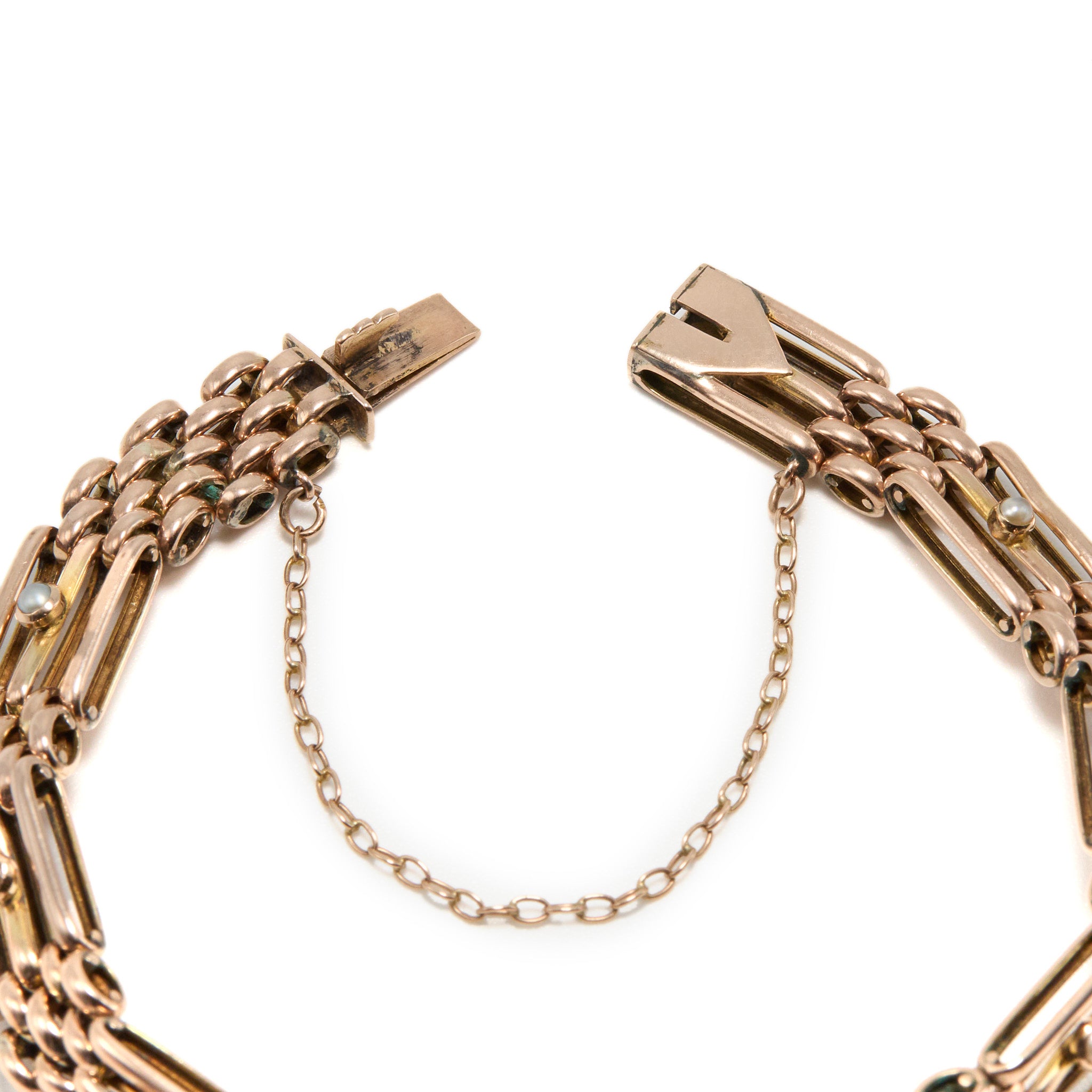 A Victorian 9ct gold gate bracelet set with three moonstones and five natural half pearls. It is marked 9ct on the integral clasp and has a safety chain. Circa 1880.