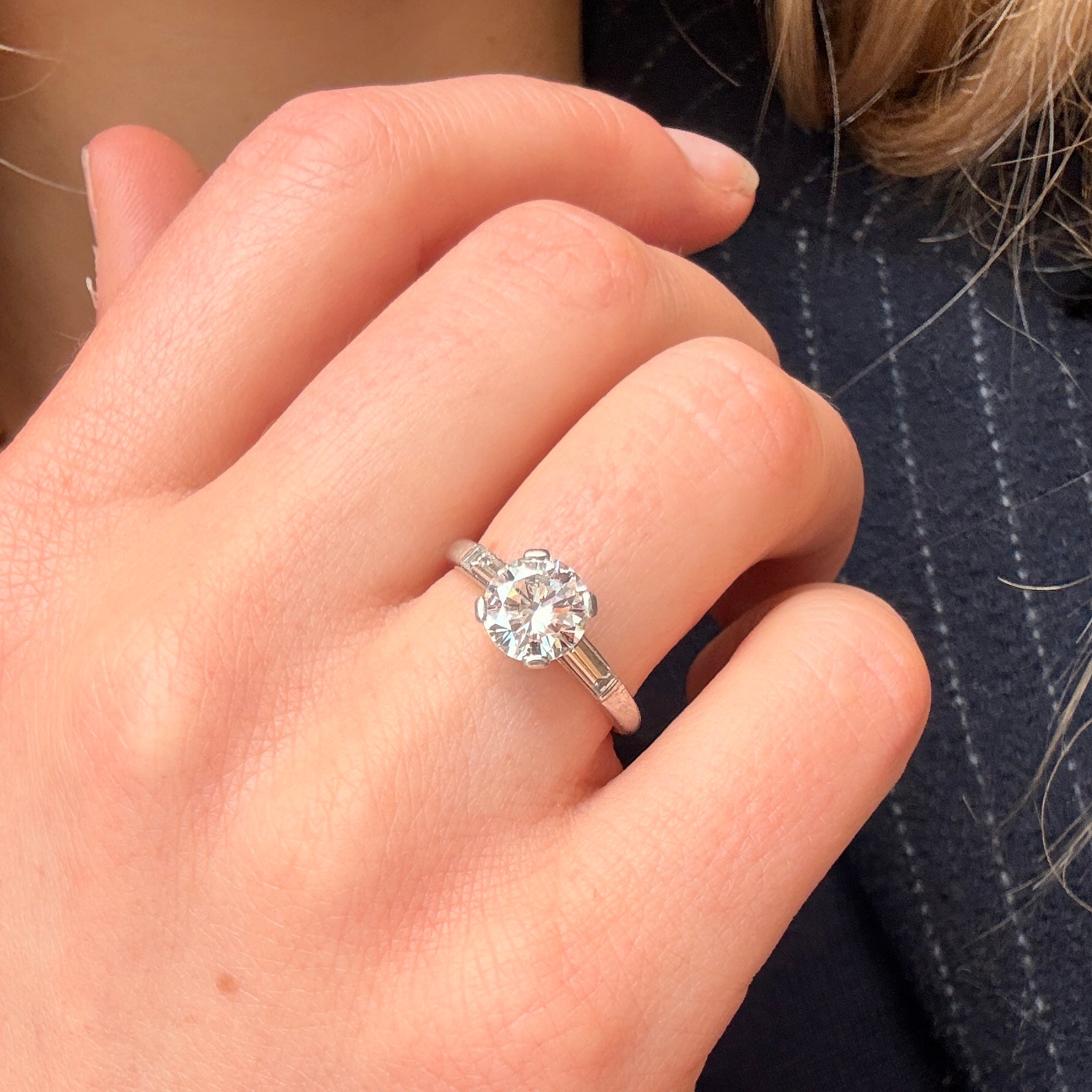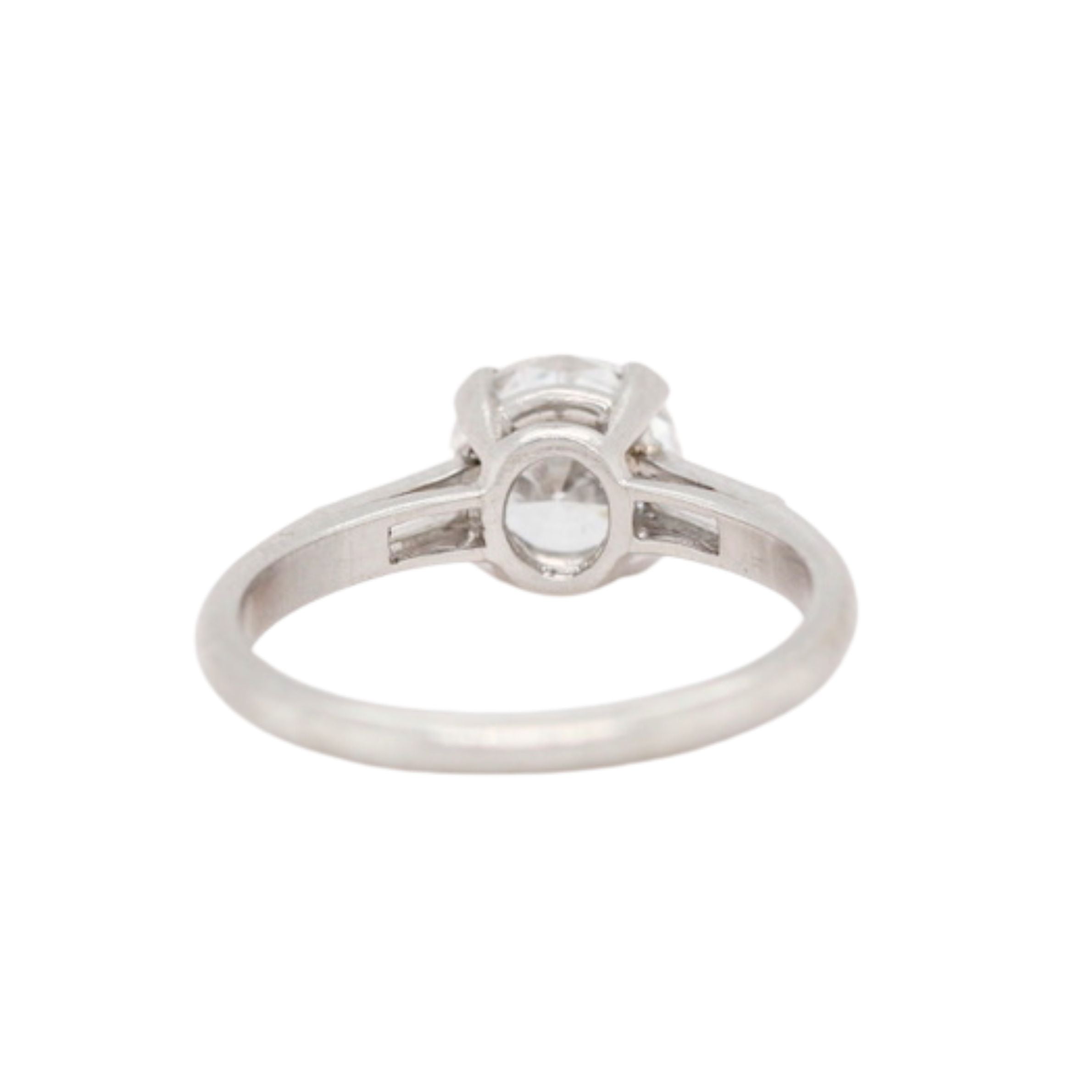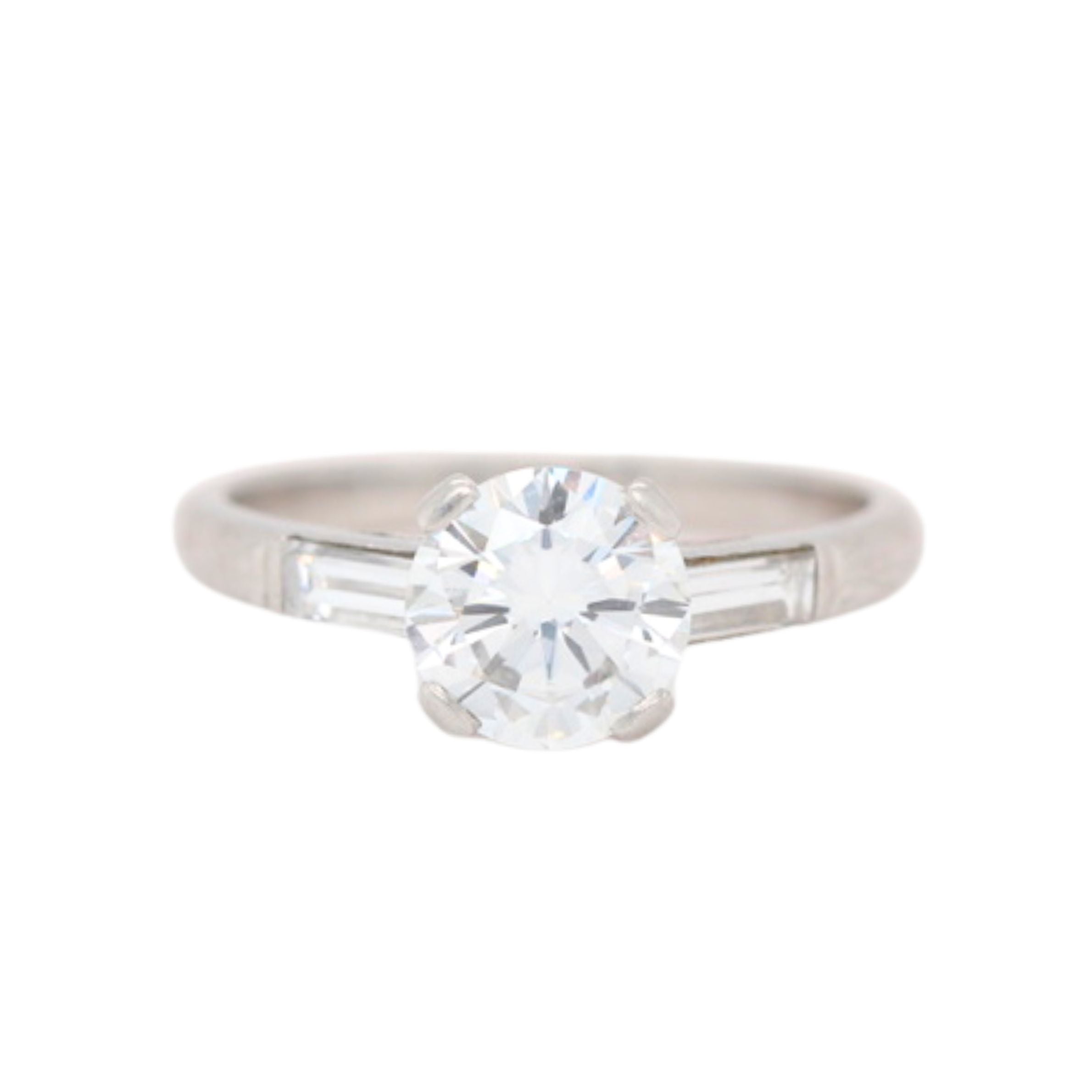An elegant platinum diamond solitaire ring, set with a brilliant-cut centre stone weighing approximately 1.43 carats, exhibiting a bright H–I colour and exceptional VVS2 clarity. The central diamond is beautifully complemented by tapered baguette-cut diamond shoulders.The shoulder stones weigh approximately 0.40 carats in total, bringing the combined diamond weight to an impressive 1.83 carats. Circa 1990.
