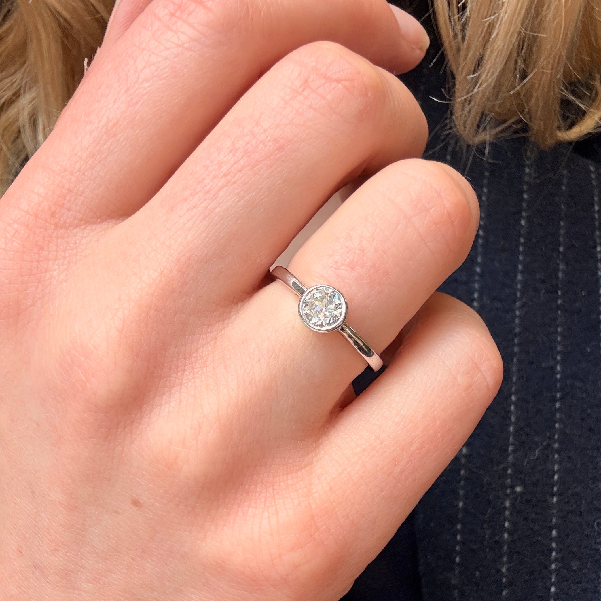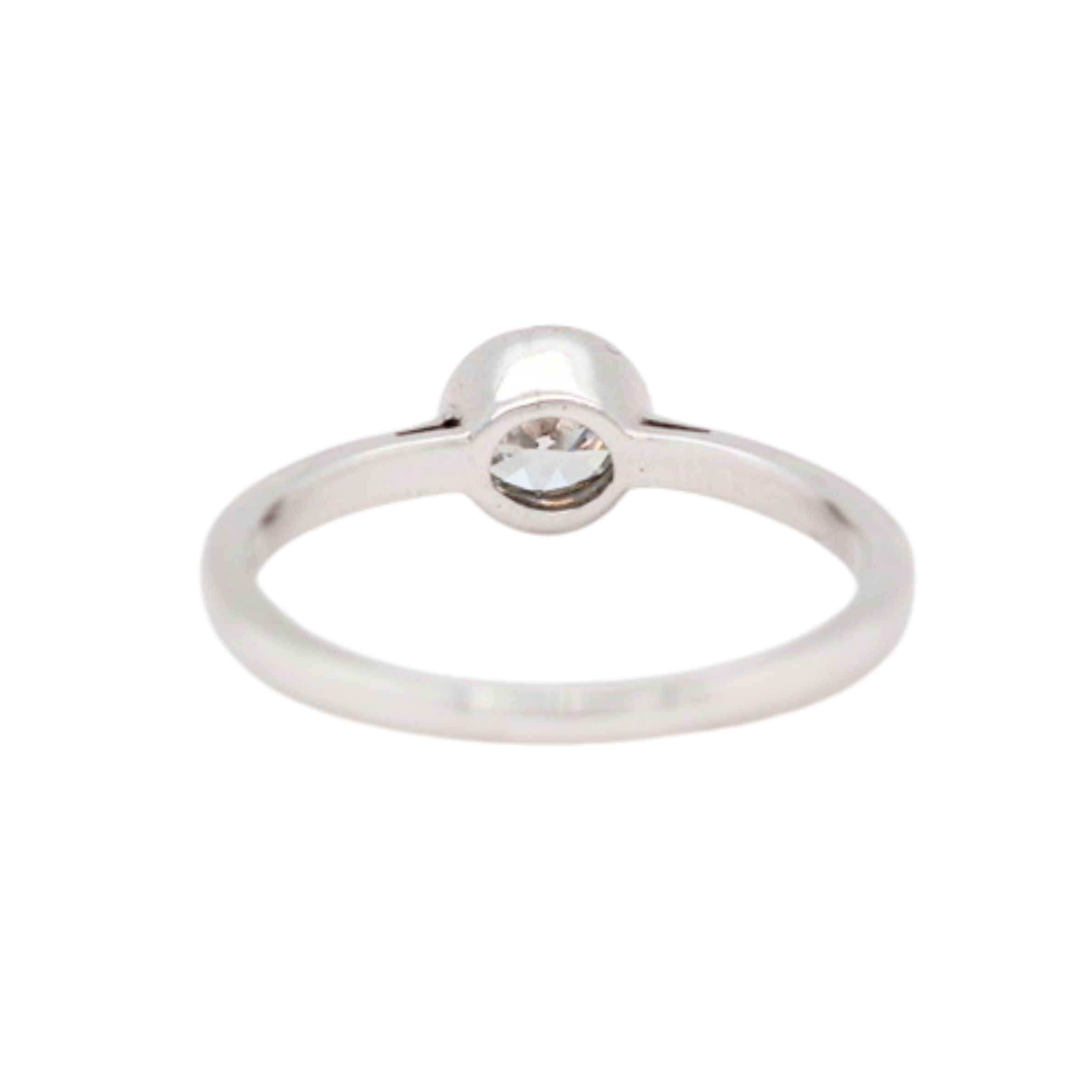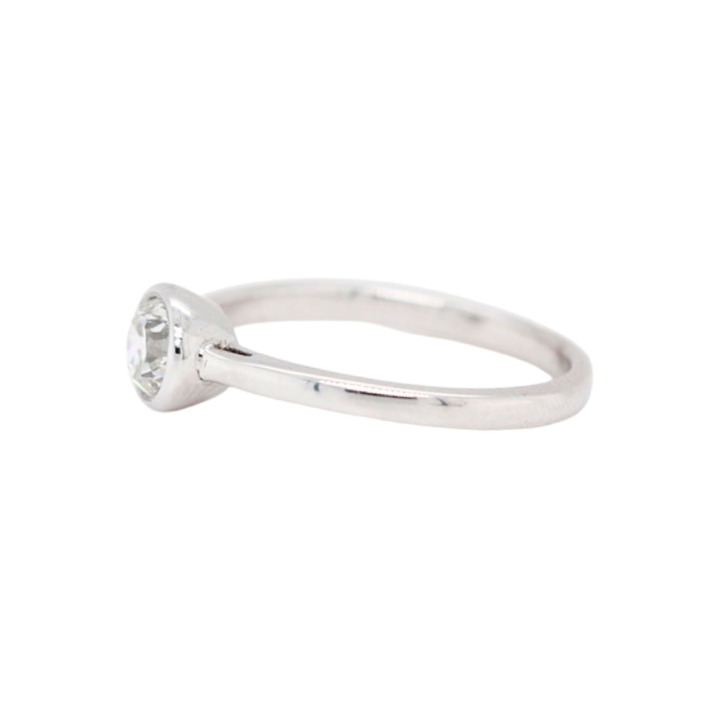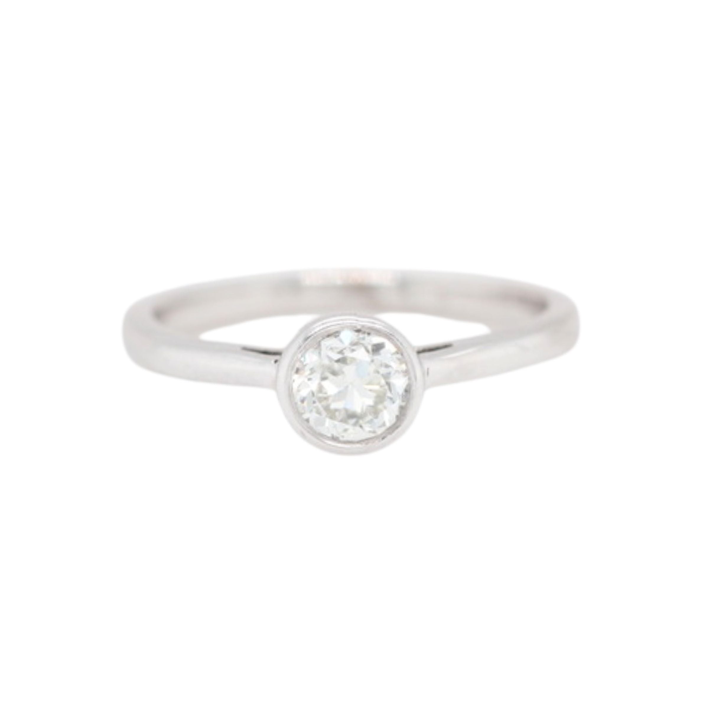 A vintage diamond solitaire ring, crafted in platinum circa 1980, showcasing a beautifully proportioned Old European cut diamond weighing approximately 0.55 carats. The diamond is an estimated K–L colour and VS clarity. Elegantly set in a smooth bezel.