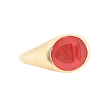 A striking and substantial carnelian signet ring, crafted in 18ct gold. The oval bezel is set with a carnelian, finely engraved into the surface is a heraldic shield motif, surmounted by a detailed crown. The shoulders taper smoothly into a solid, well-balanced band. The gold bears a “750” hallmark, confirming 18 carat.