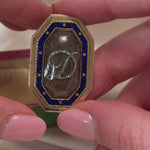 Georgian 18ct gold and star inlaid blue enamel brooch/pendant with a central letter D set in silver and rose cut diamonds on a plaited hair background in a rectangular shape with chamfered corners. Circa 1780