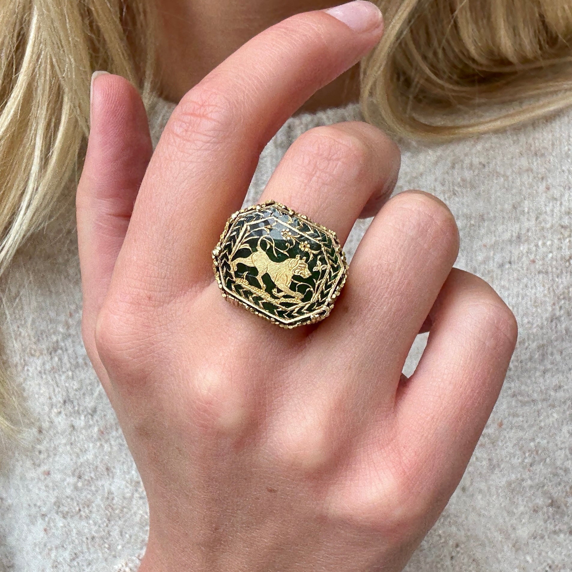 An Indian Pratapgarh Thewa ring featuring a central octagonal green glass panel adorned with an intricate gold foil depiction of a tiger amidst foliage. This traditional craftsmanship originates from 18th-century Pratapgarh, Rajasthan, where the ‘Thewa’ technique involves fusing finely worked gold foil designs onto colored glass. The mount, composed of tubular segments of 18ct gold arranged in an openwork pattern, dates to the 1970s.
