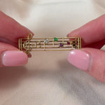 A beautiful musical stave acrostic puzzle brooch, set with gemstones that spell the word "Dear" - Diamond, Emerald, Amethyst and Ruby. The musical notes also read D E A and R. Handcrafted in fine 18ct gold. The brooch has a safety clasp and is in excellent condition. Circa 1960.