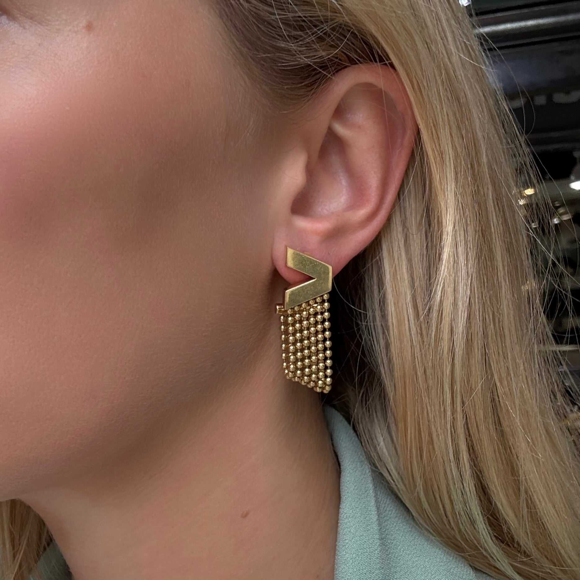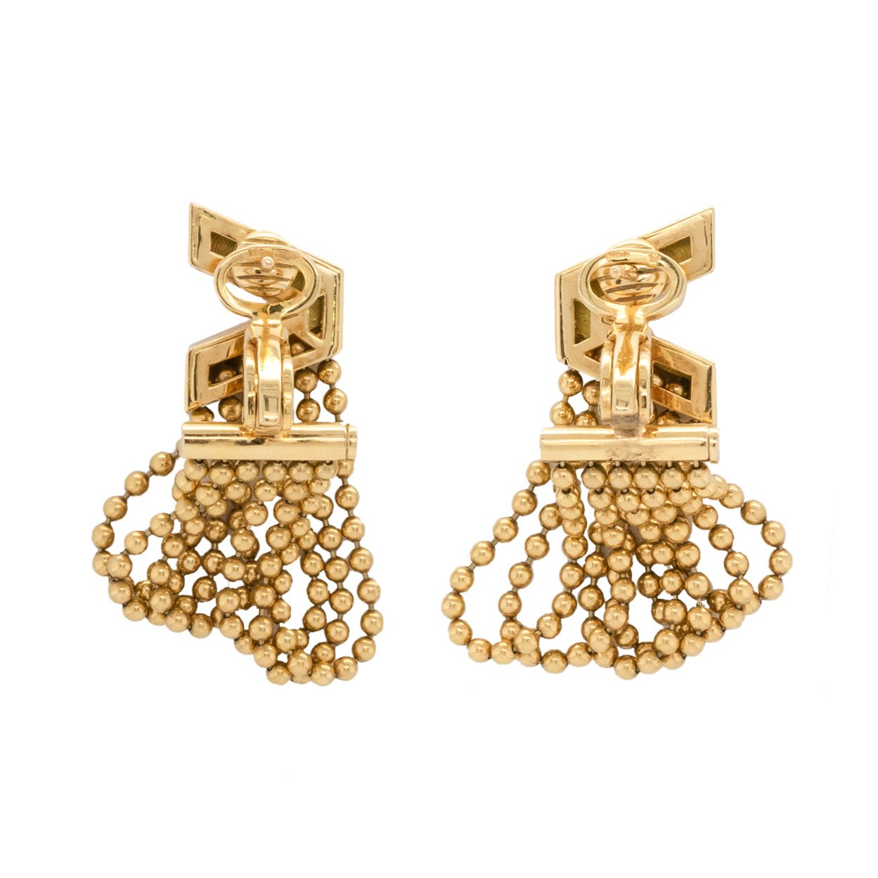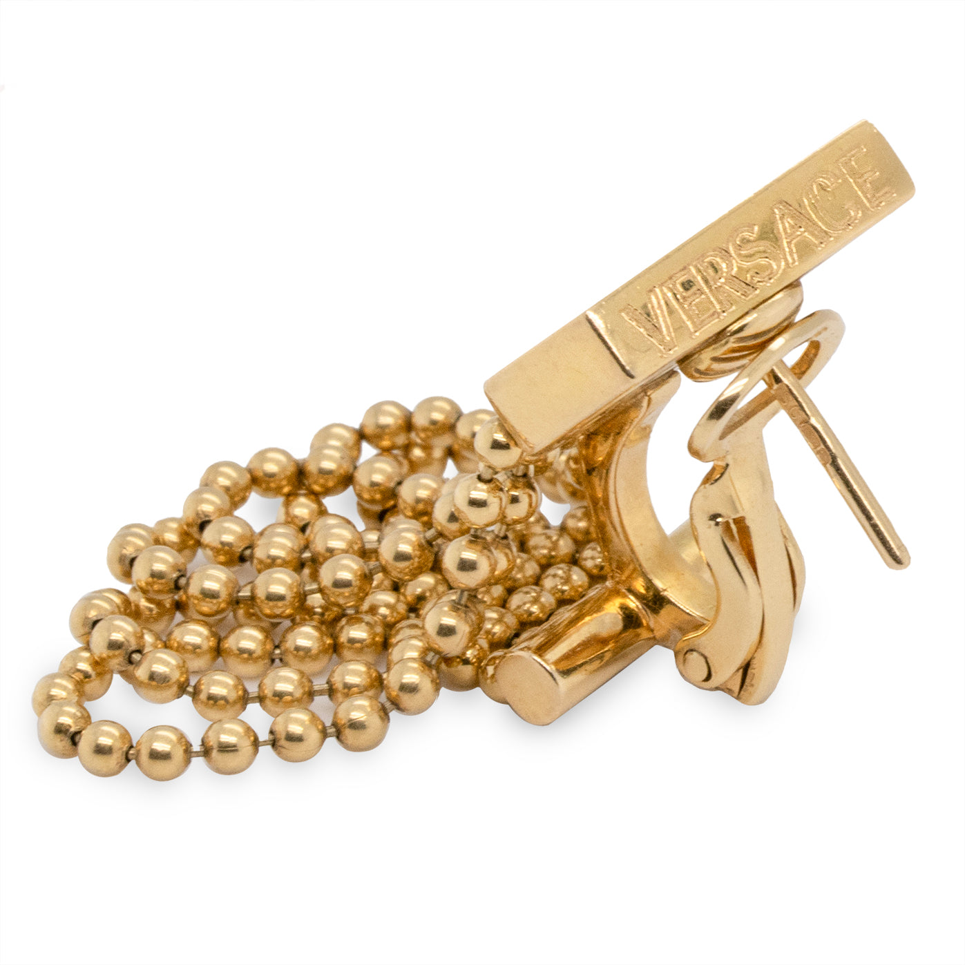Statement Versace 18ct gold earrings. The inverted V signed on top of one earring "Versace" with loops of 6 chains made up of balls dangling from the V, 24.1 grams, post and clip fittings. The posts with a makers mark "SC 750 Birmingham". Circa 1990