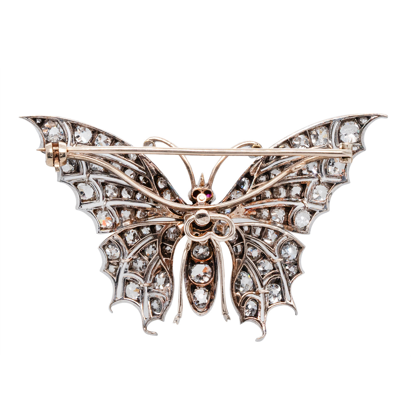 A stunning Victorian old cut and rose cut diamond butterfly brooch resembling a swallowtail, set in gold and silver. This antique brooch is set with cabochon ruby eyes. The total diamond carat weight is approximately 6.5 carats, I colour, VS-SI clarity. It has the original detachable brooch fitting on the back. Circa 1860-70.