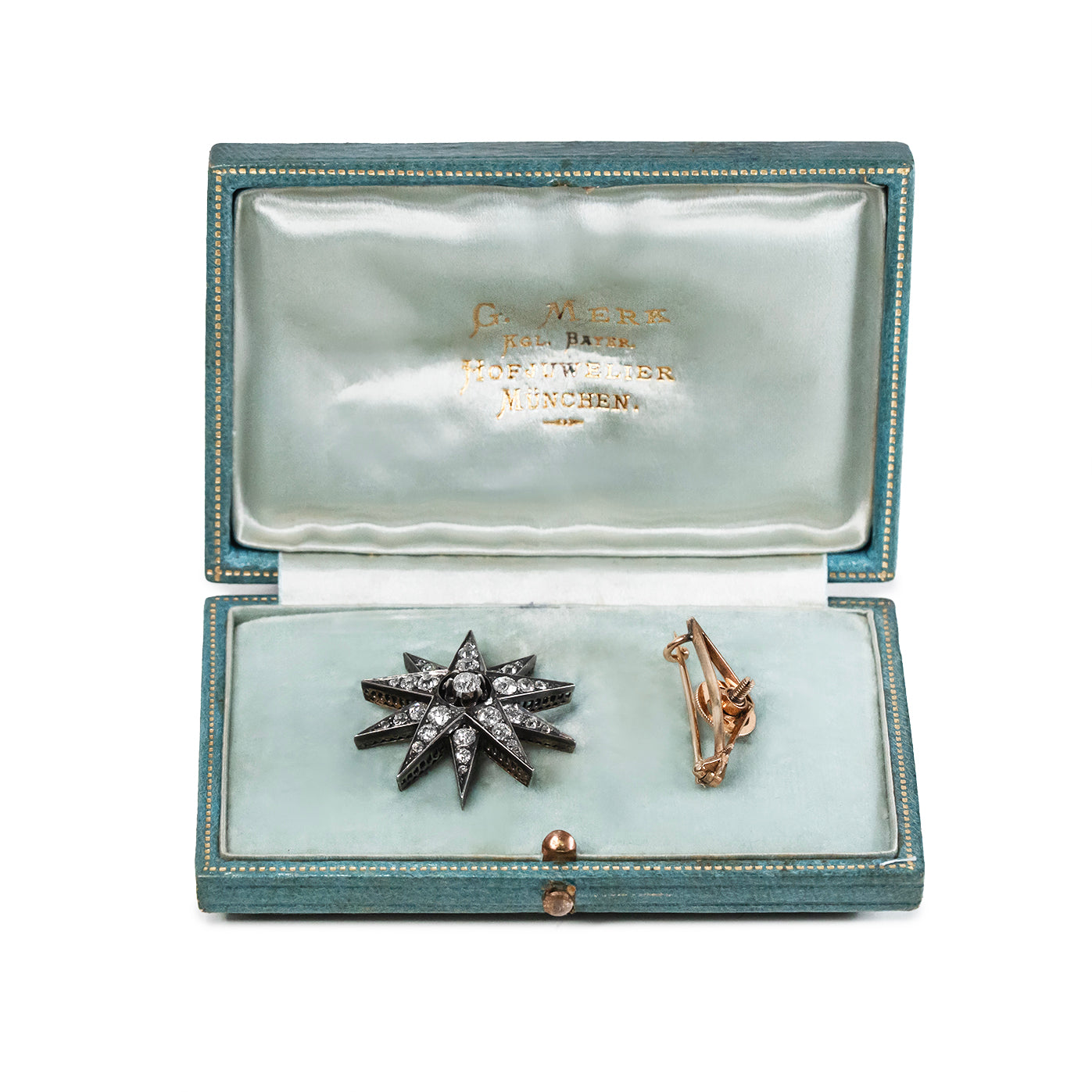 This is a really striking Victorian star brooch that can also convert into a hair piece. Featuring approximately 2.4 carats of old mine cut diamonds, , I/J colour, SI1/2 clarity. This beautiful brooch is presented in its original retailers box for G Merk in Munchen, Germany. The star is set in 18ct gold and silver and the fittings are in gold. Circa 1870.