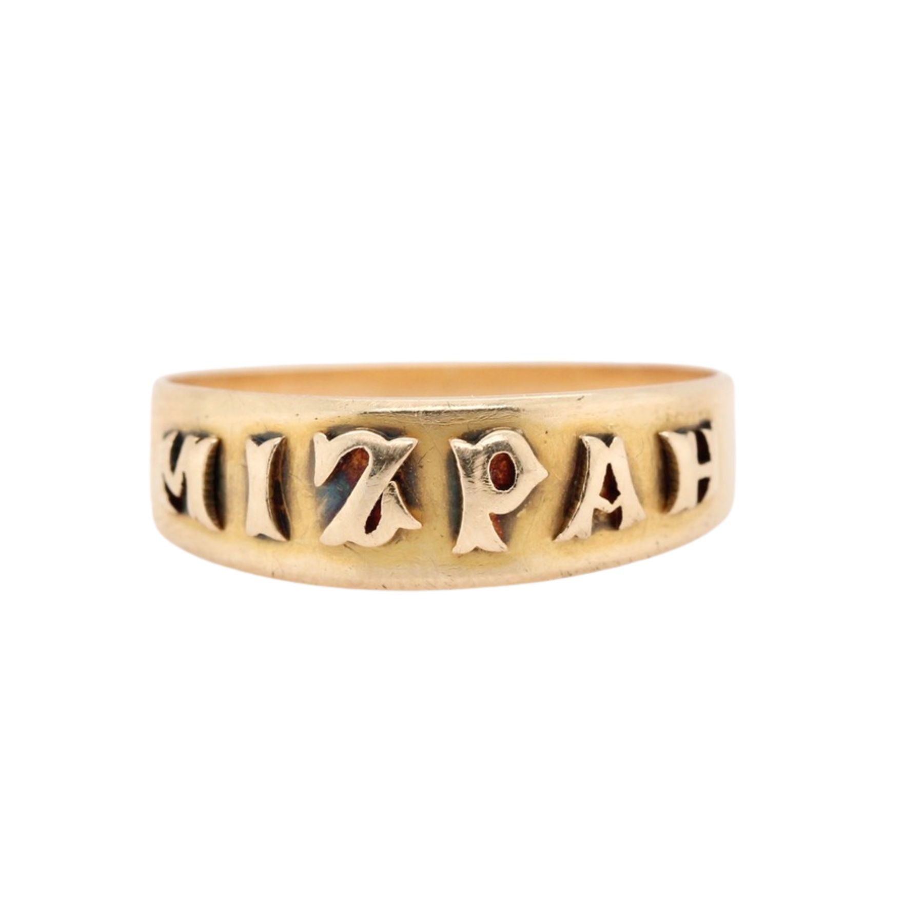 An 18ct gold Victorian Mizpah band ring, circa 1870, inscribed with the word “Mizpah” on the front and marked 18ct with the maker’s mark B&H. The term “Mizpah,” derived from a biblical blessing, symbolises an emotional bond between two people separated by distance, often exchanged as a token of remembrance and protection.
