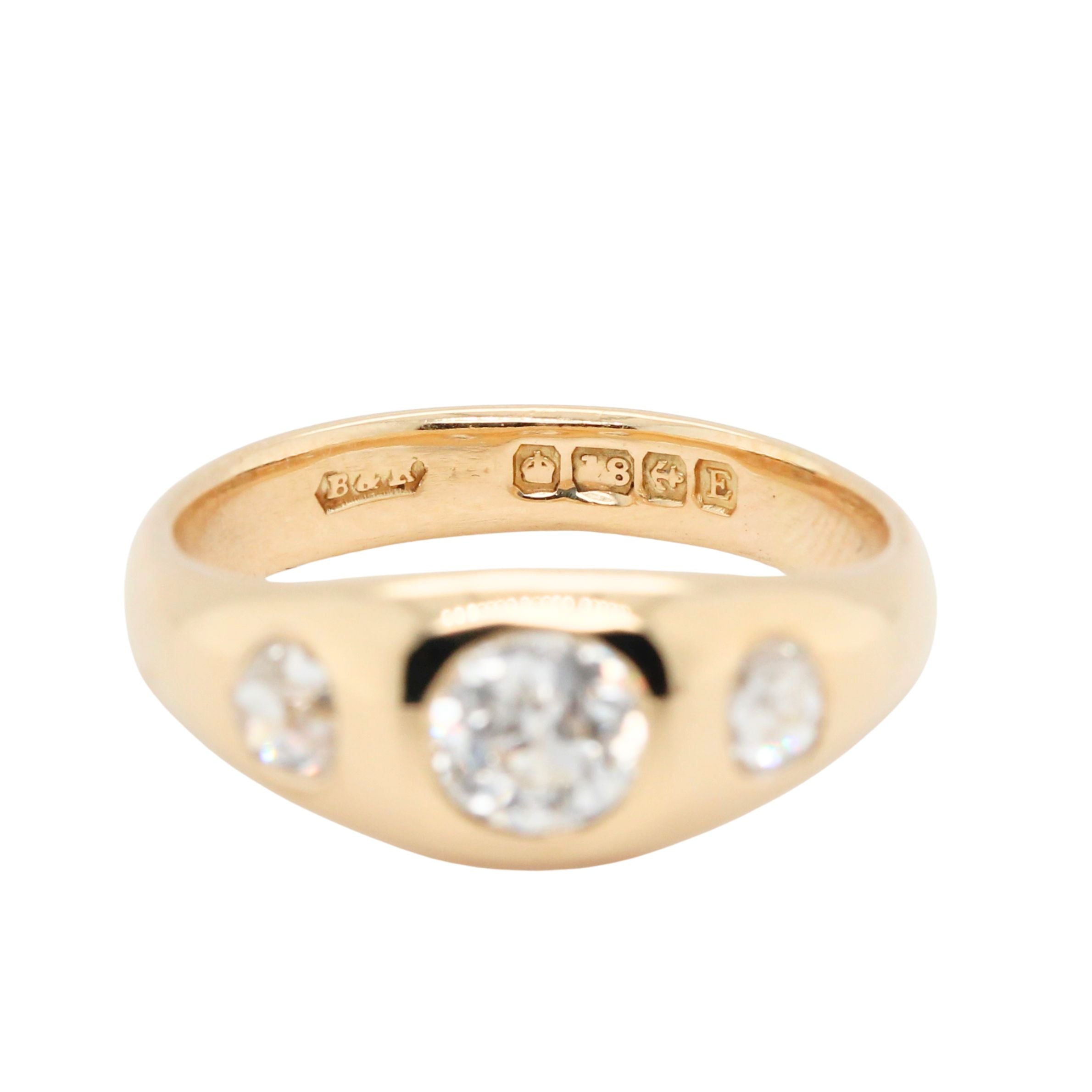 A fine Victorian diamond gypsy ring crafted in 18ct gold and hallmarked for Birmingham, 1853. The ring is set with three Old European cut diamonds totalling approximately 1.27 carats, comprising a central stone of approximately 0.74 carats, flanked by diamonds of approximately 0.29 and 0.24 carats. The diamonds are assessed as K–L colour with SI clarity. Substantial and beautifully proportioned, the ring weighs approximately 6.1 grams and is a classic example of mid-19th-century English craftsmanship.