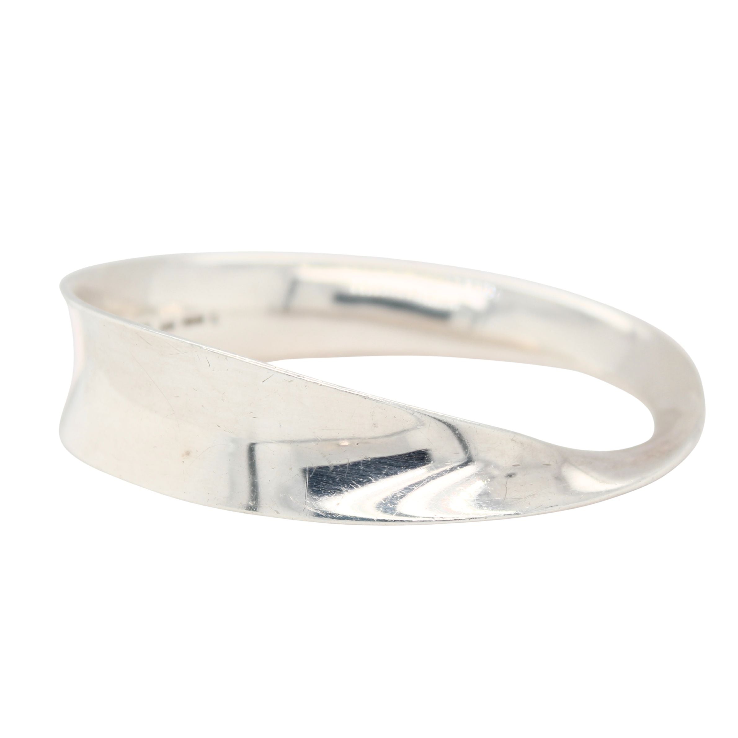 A striking and sculptural Mobius bangle by Torun Bülow-Hübe for Georg Jensen, crafted in sterling silver. Inspired by the fluid, continuous form of the Möbius strip, Torun’s design reflects her signature philosophy of timeless minimalism and organic movement. Having joined Georg Jensen in 1969, Torun brought a distinctly modern Scandinavian sensibility to the house, emphasizing clean lines, sensual curves, and jewelry that interacts harmoniously with the body.