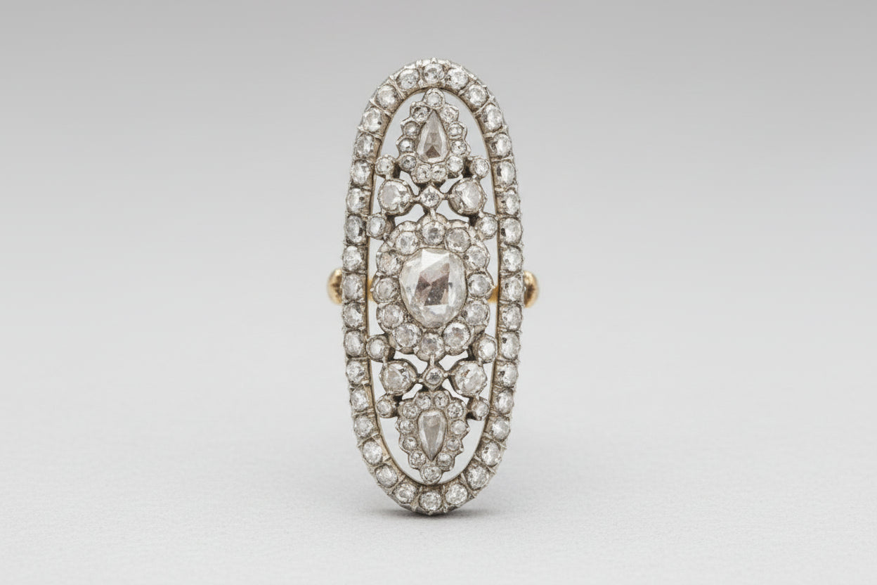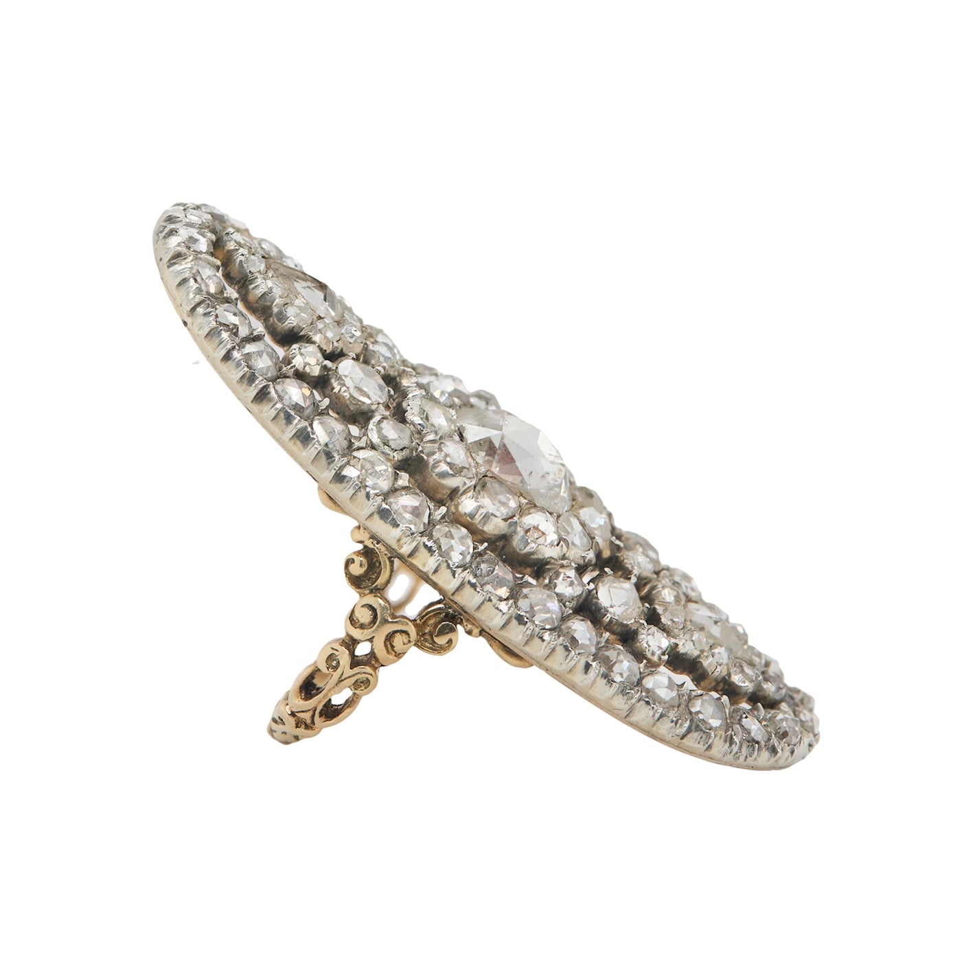 The ring is set with approximately 6.2 carats of rose-cut diamonds, arranged in a dramatic central cluster, highlighted by a larger centre stone of approximately 1.50 carats. Two elegant pointed oval diamond clusters accent either end of the plaque, while a complete surround of shimmering rose diamonds frames the design, enhancing its scale and brilliance.