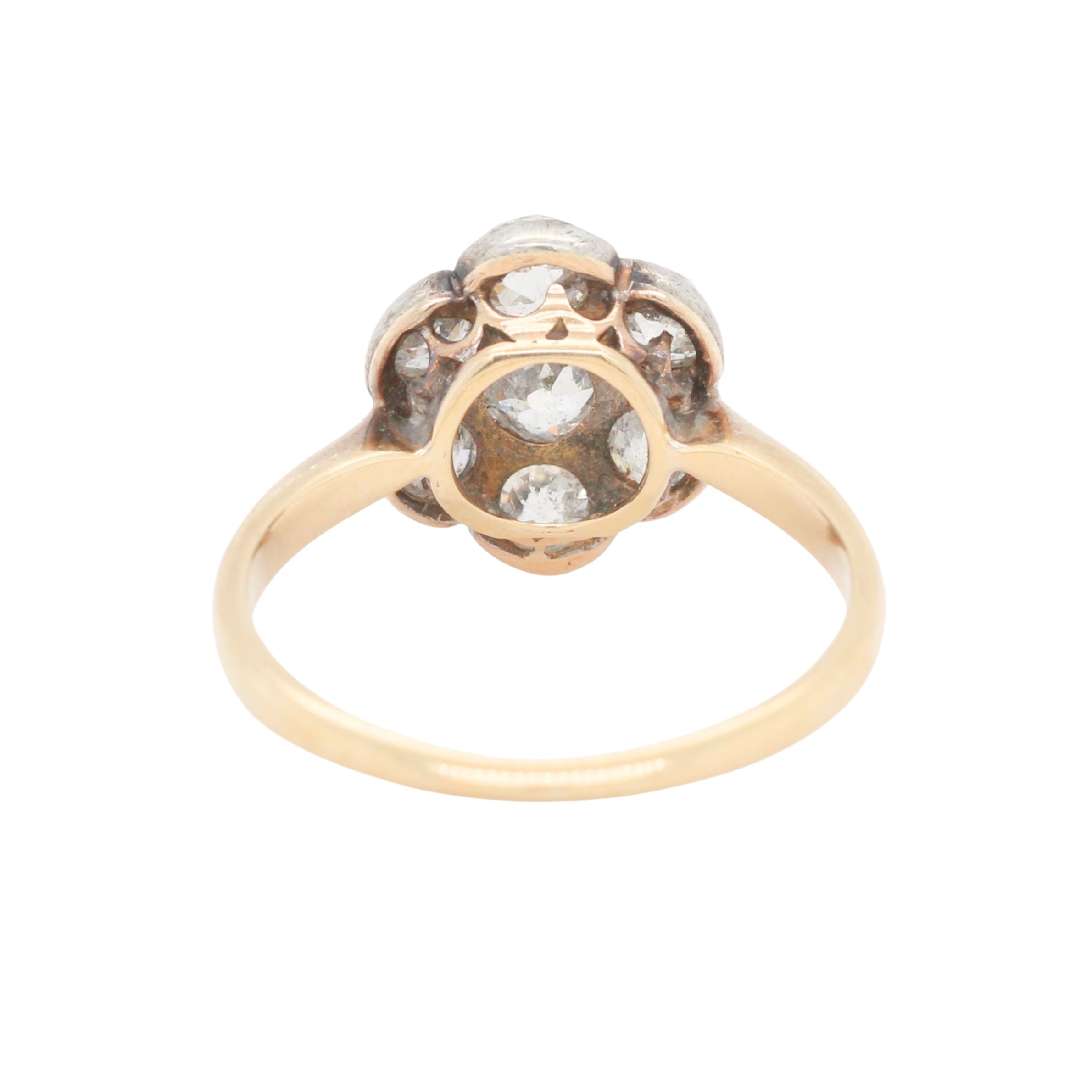 A beautifully preserved Victorian diamond cluster ring, dating to the late 19th century. The ring is designed in a classic daisy cluster, featuring a central old-cut diamond surrounded by seven matching old-cut diamonds. The diamonds are set in a silver-topped mount, a traditional Victorian technique used to enhance the natural sparkle of the stones, the band is crafted in 18ct gold.