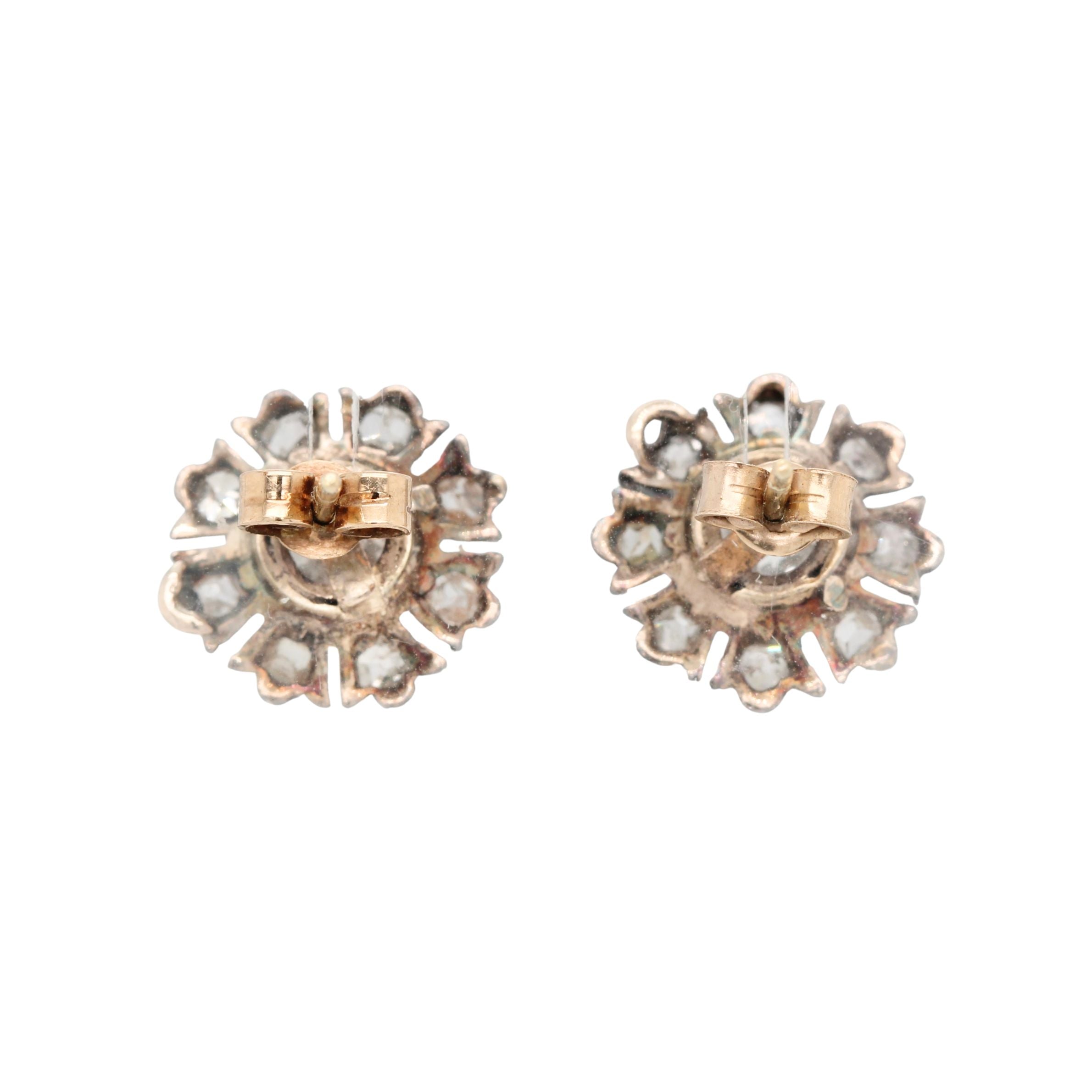 A beautiful pair of Old Mine Cut Diamond Gold and Silver Stud Earrings, estimated total diamond weight approximately 1.80ct. Each earring is designed as a classic cluster, with a larger Old Mine Cut diamond to the centre, surrounded by a halo of smaller Old Mine Cut diamonds in a floral, sunburst formation. The estimated total diamond weight is approximately 1.80 carats, assessed as G–H colour and VS1–SI1 clarity.