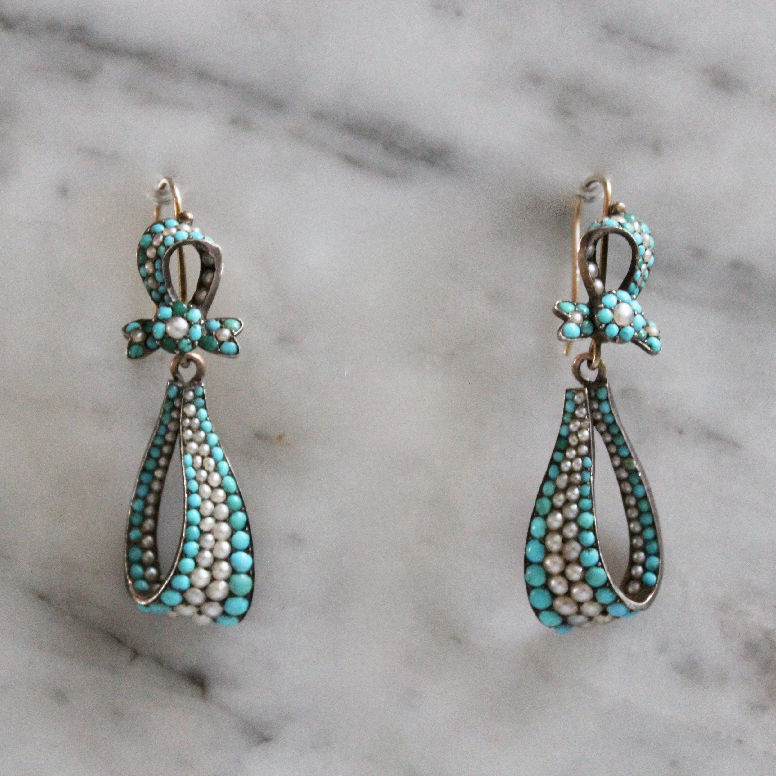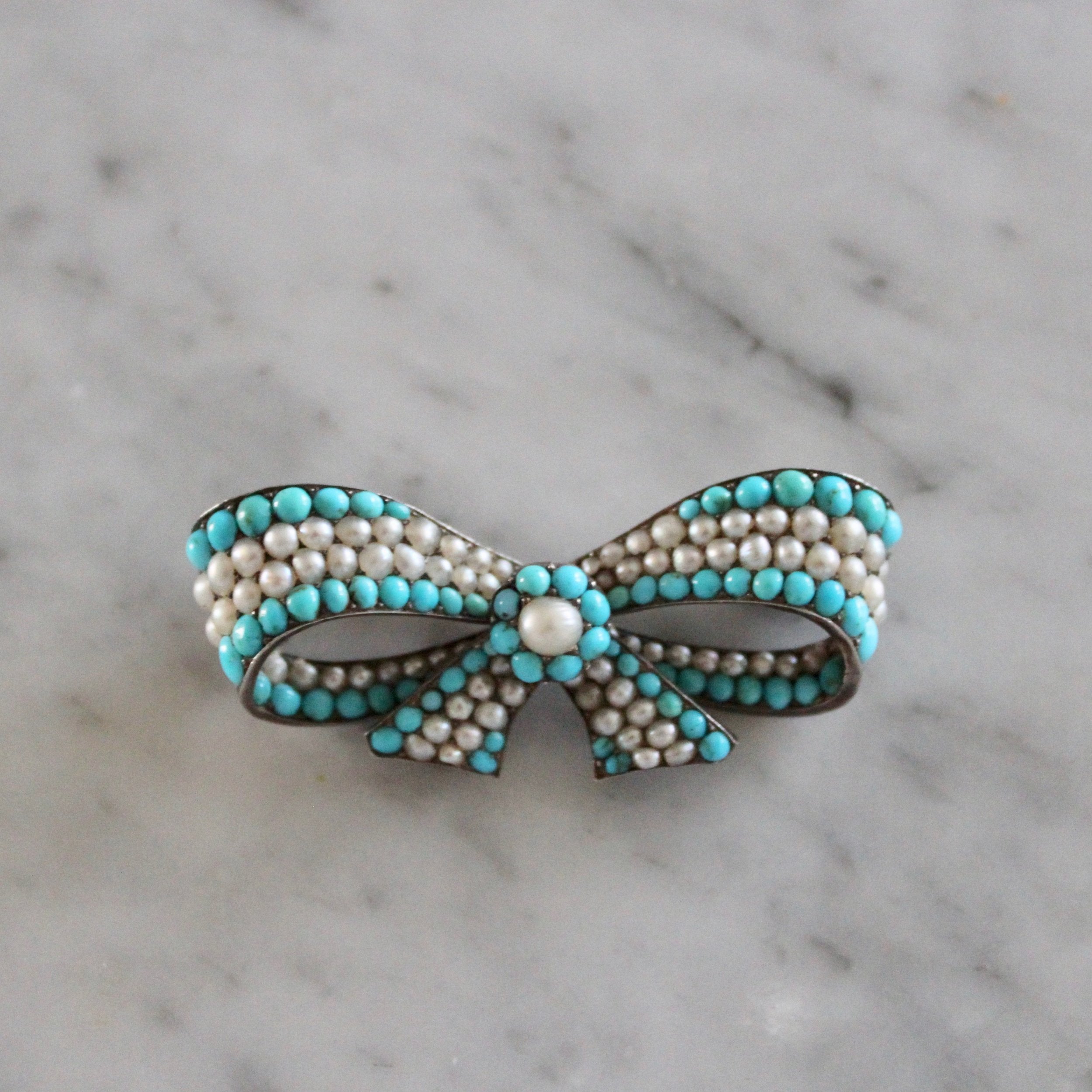 Victorian Turquoise and Natural Pearl Bow Suite-Charlotte Sayers Antique Jewellery