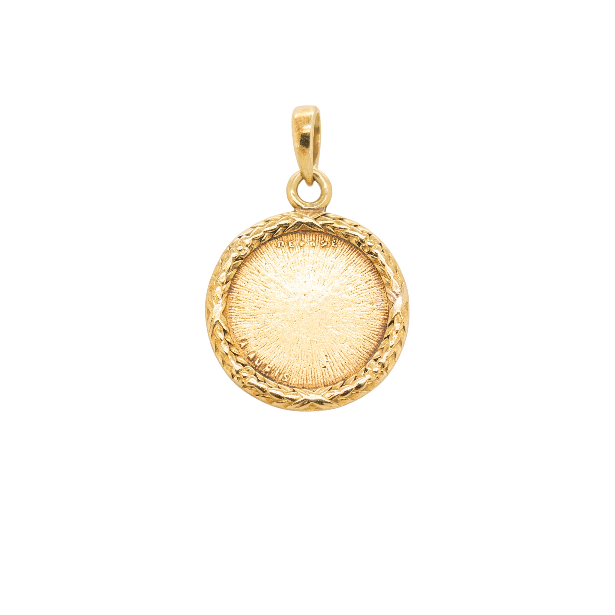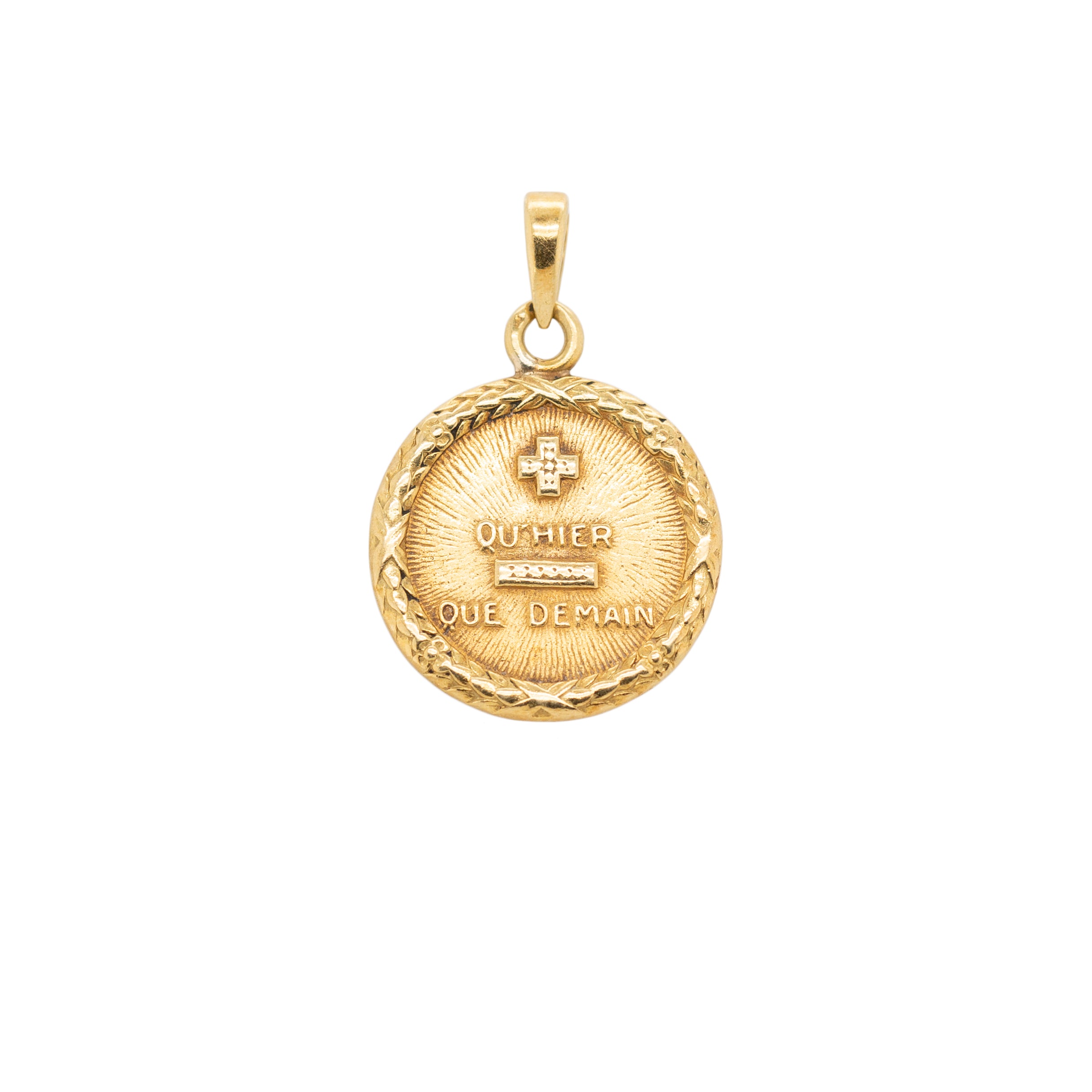 An 18ct gold French pendant, circa 1910–1920, finely crafted and inscribed with the motto “+ qu’hier - que demain” (“I love you more than yesterday and less than tomorrow”). The design is framed by a laurel-wreath border, and the reverse is marked “Déposé A. Augis.”