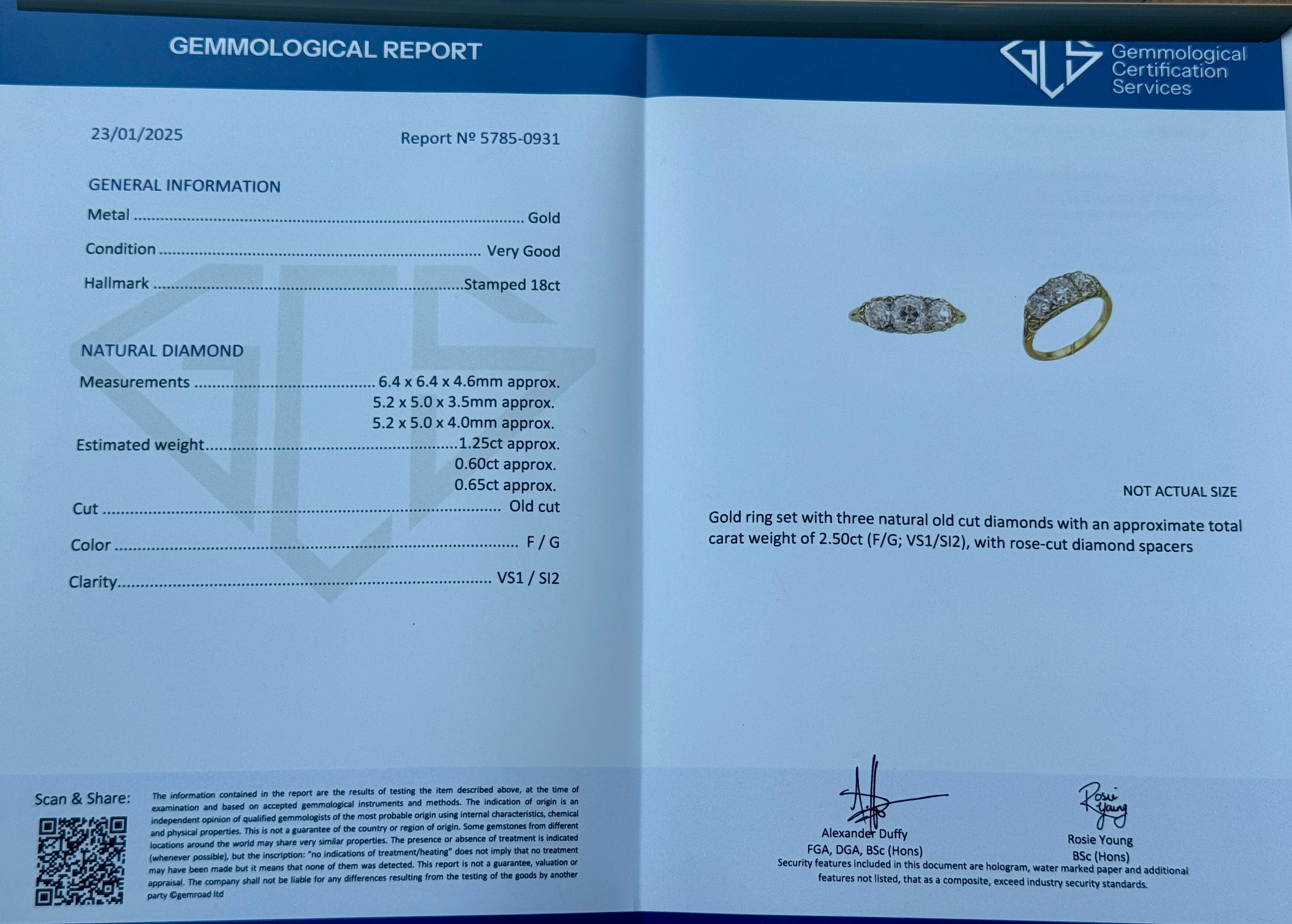 A wonderful example of a Victorian old mine cut three stone diamond ring in a carved 18ct hoop setting. The central stone is approximately 1.5 carats, the two side stones are 65 points and 82 points with small rose cut diamond points. This ring has a certificate from GCS. Circa 1870.