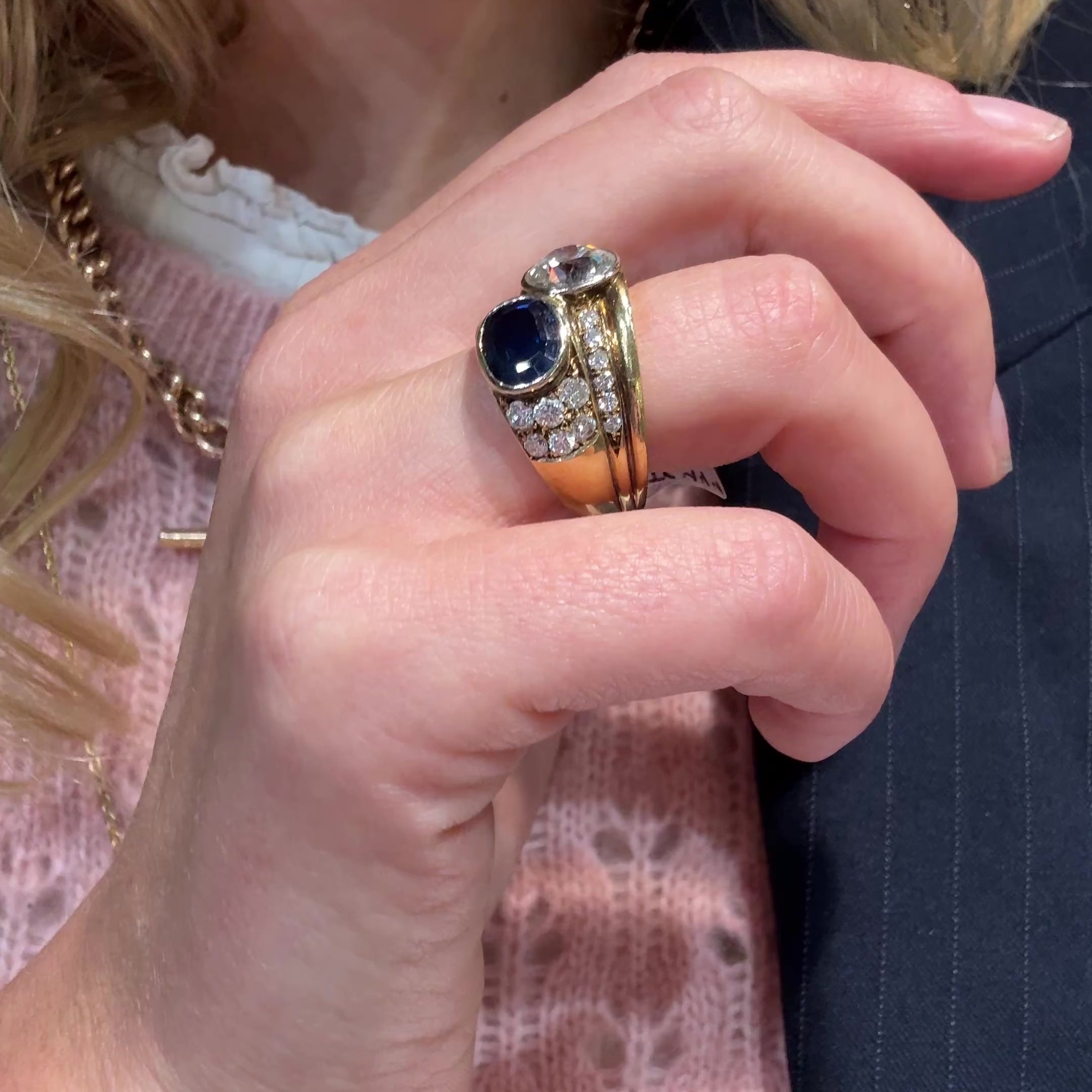 A truly remarkable vintage 18ct gold sapphire and diamond band ring of bold and luxurious design. This striking piece features a 2.5 carat old European cut diamond of I colour and VS2 clarity, paired with a richly hued 2.25 carat sapphire. The two principal stones are set side by side. Surrounding them are approximately 70 points of brilliant cut diamonds, H–I colour and SI1–SI2 clarity, pavé set along the shoulders. The substantial gold band tapers towards the back. The ring is marked 750 inside the shank. Fully certified by WGI.