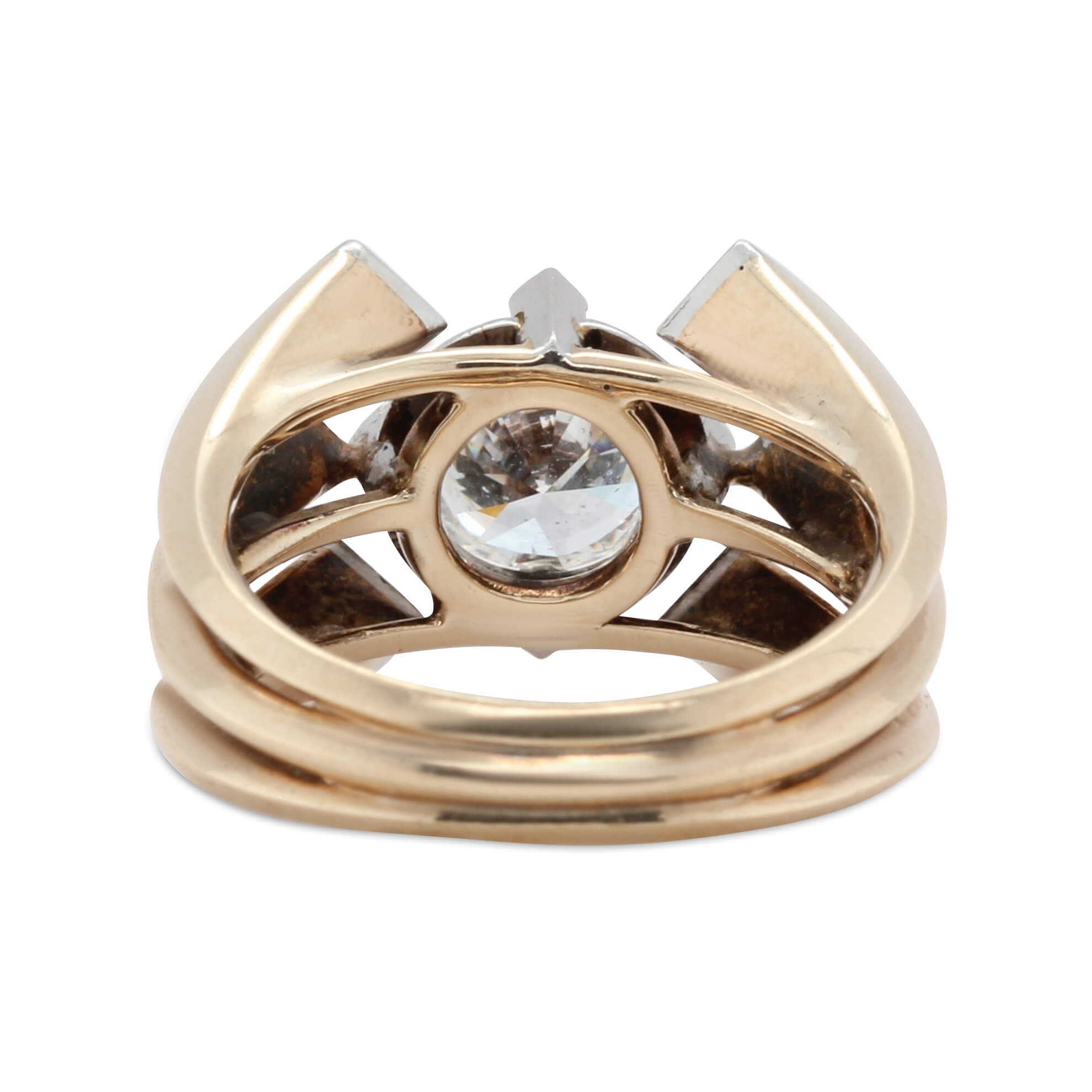 A statement 1940s transitional cut and carré cut diamond ring set in 18ct gold and platinum. The centre stone is approximately 1.3 carats with a total diamond weight of 2.5 carats. Centre stone J colour SI1.