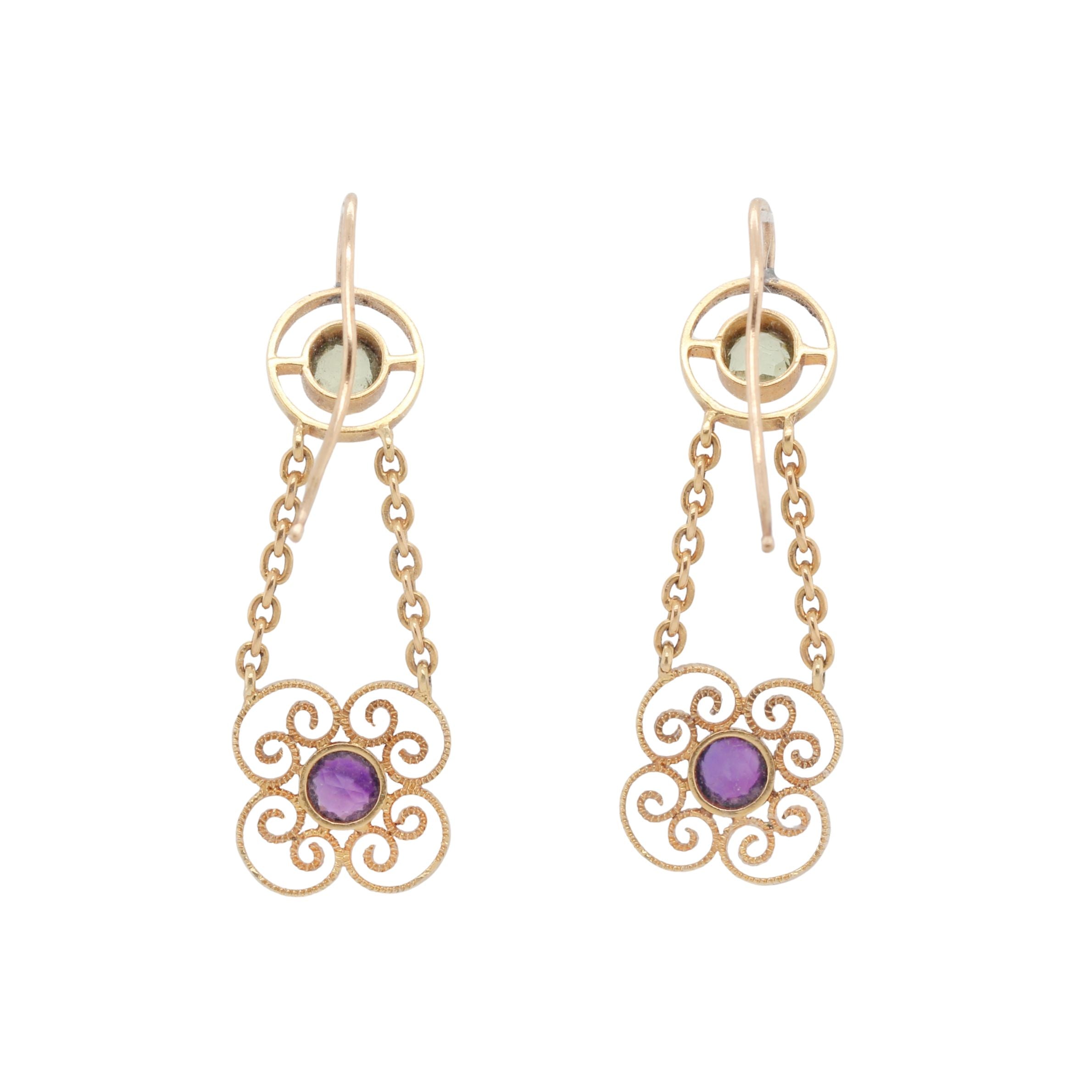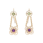 A very pretty pair of 15ct gold amethyst and peridot drop earrings, dating to circa 1880. Each earring features a delicately set peridot at the top, from which two fine trace-link chains suspend an amethyst. The amethyst is framed within an ornate quatrefoil surround, worked in rich gold with elegant scrolling detail. Light and graceful in movement, these Victorian earrings have a beautiful contrast of colour.