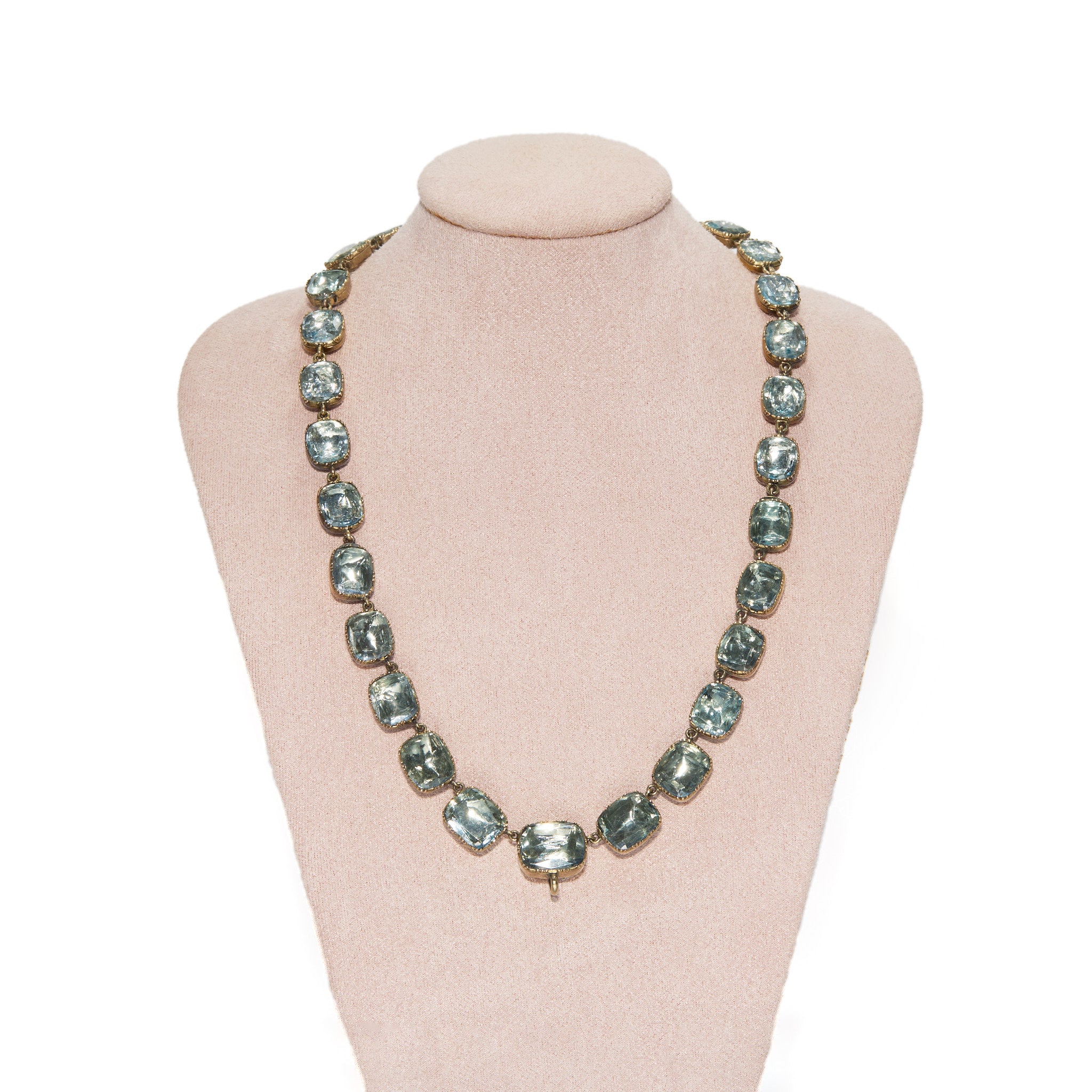 An exceptional George III rock crystal rivière necklace and matching bracelet, beautifully composed with a sequence of cushion-shaped rock crystals. Each stone is individually set in closed-back yellow gold collets.