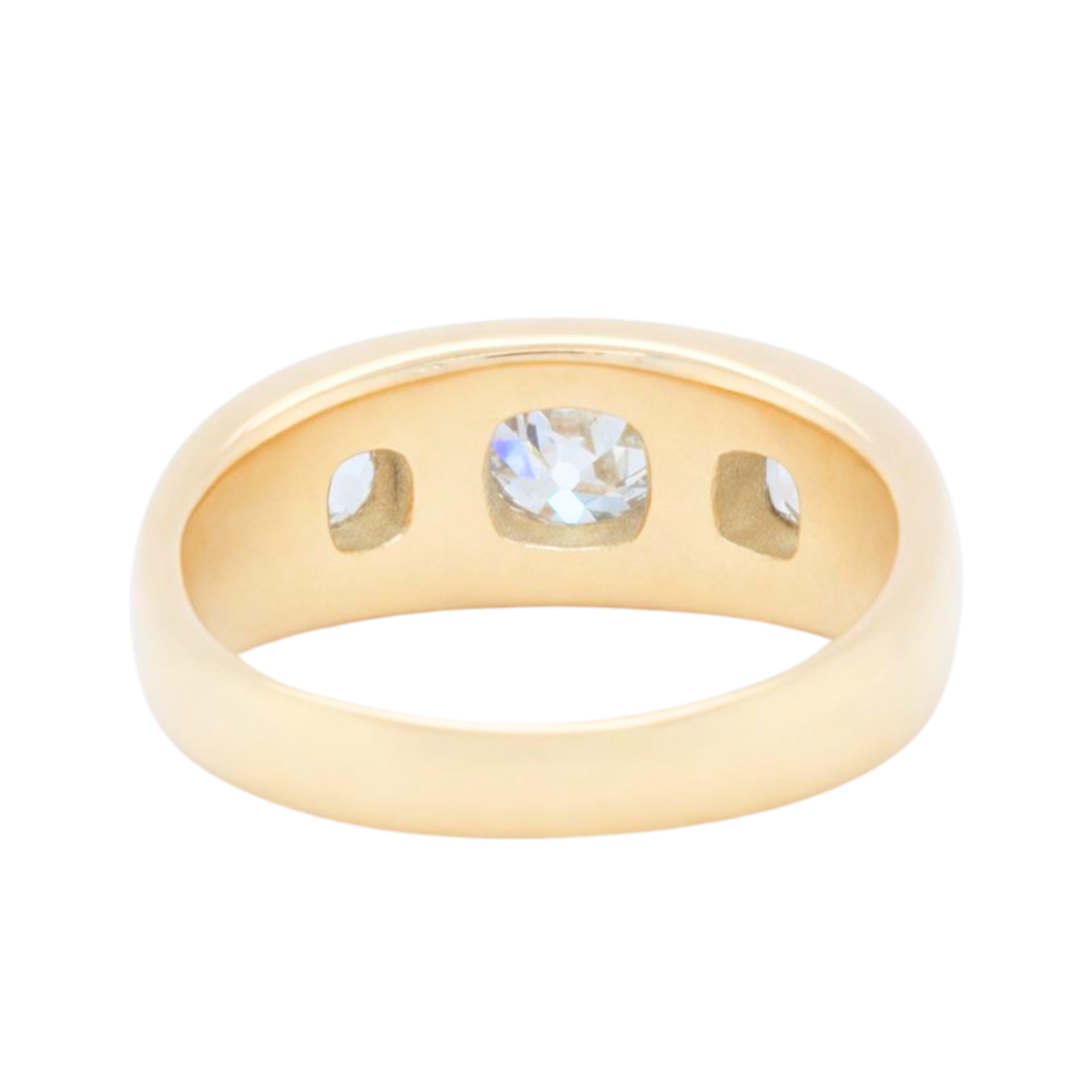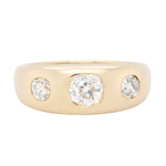An old mine cut diamond gypsy ring that is crafted in solid 18ct gold with a chunky gold band. Featuring three antique old mine cut diamonds that are flush-set into the band, the centre stone measures approximately 68 points, flanked by two side stones of approximately 27 and 25 points. Totalling 1.20 carats of diamonds with VS1 clarity and J/K colour.