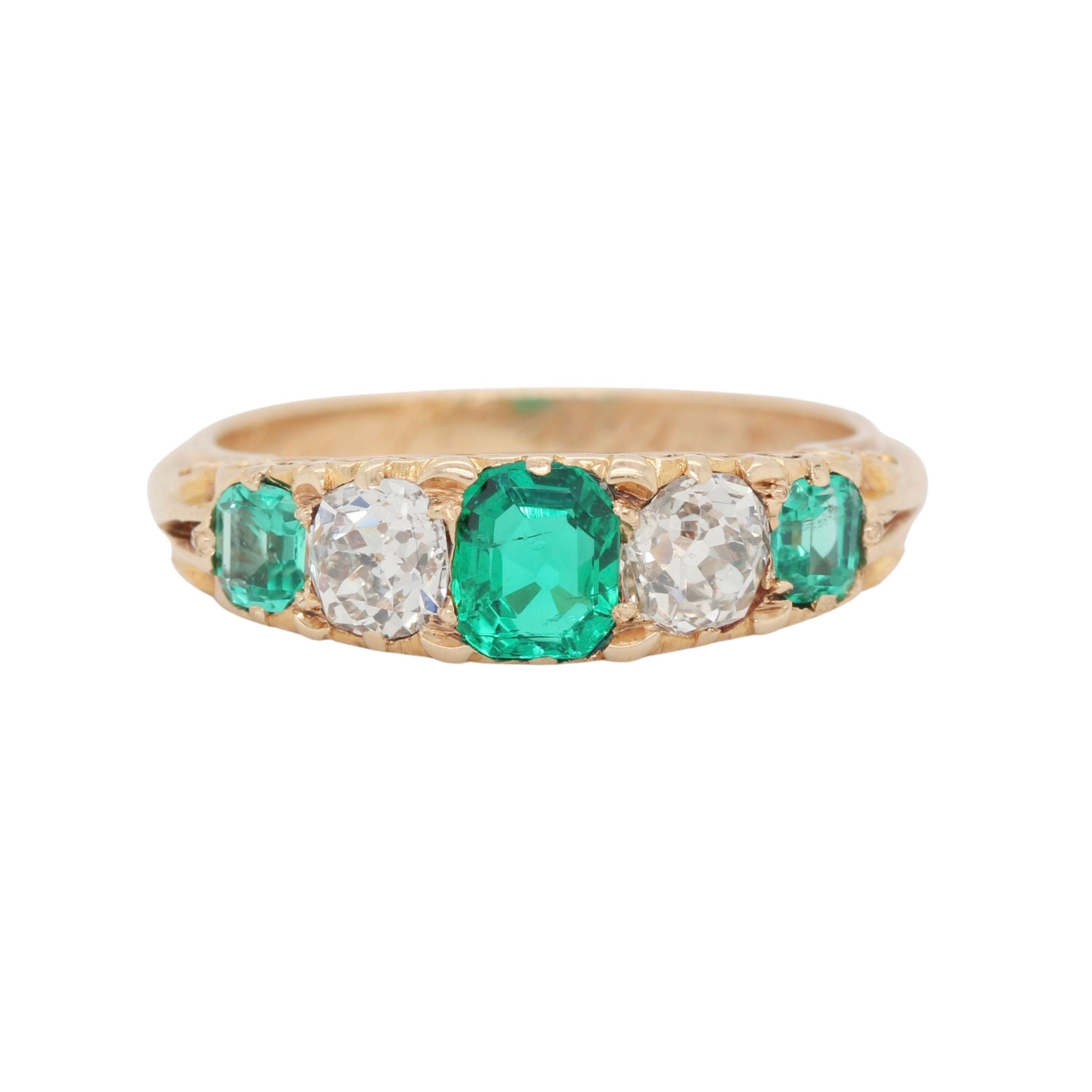 A striking Victorian Colombian emerald and diamond line ring, finely set in 18ct gold and dating to circa 1880. The emeralds, are a rich green with minor oil, they have a combined weight of approximately 0.75 carats and are complemented by old European-cut diamonds totalling approximately 0.60 carats, assessed as L/M colour. The head of the ring is subtly graduated, giving a timeless design.