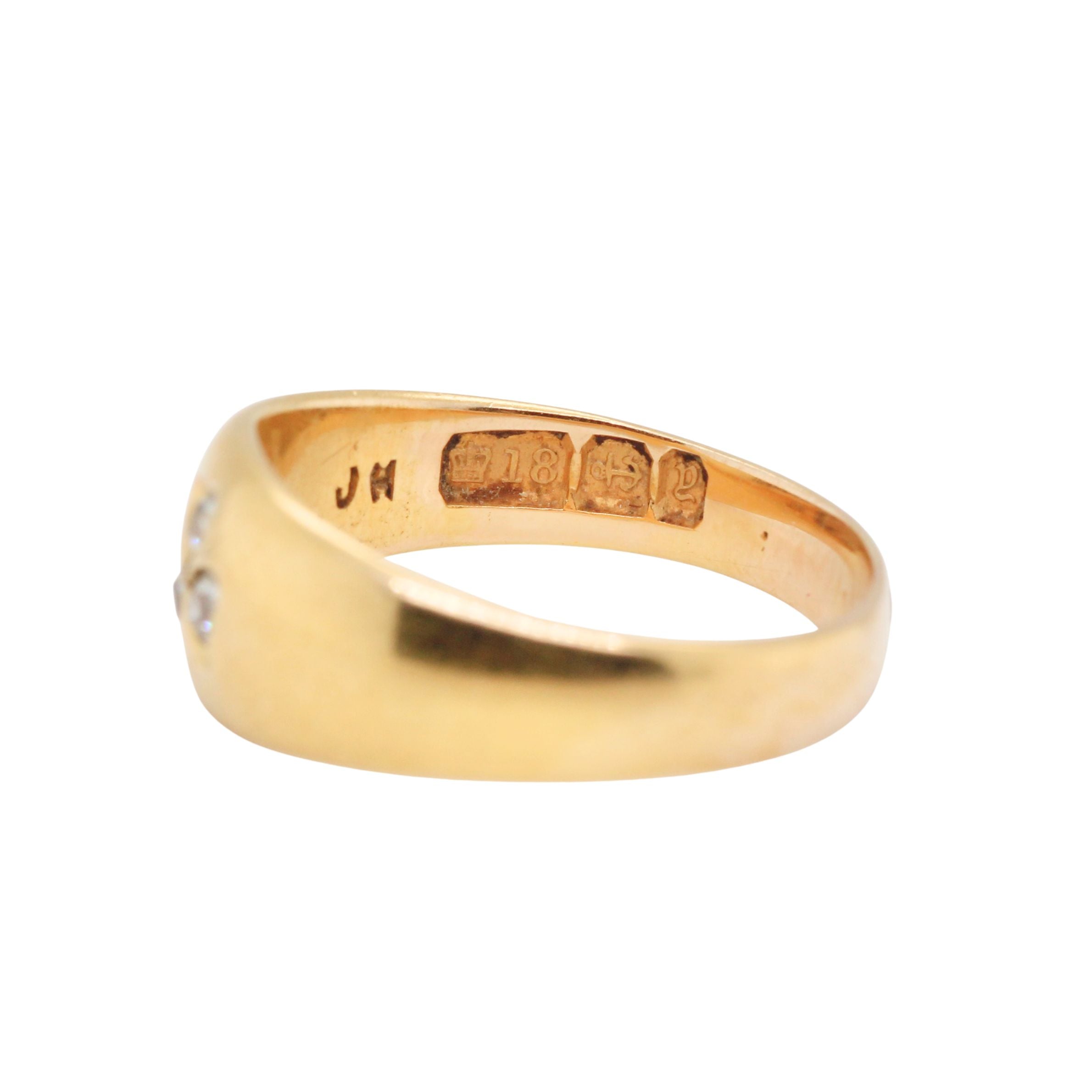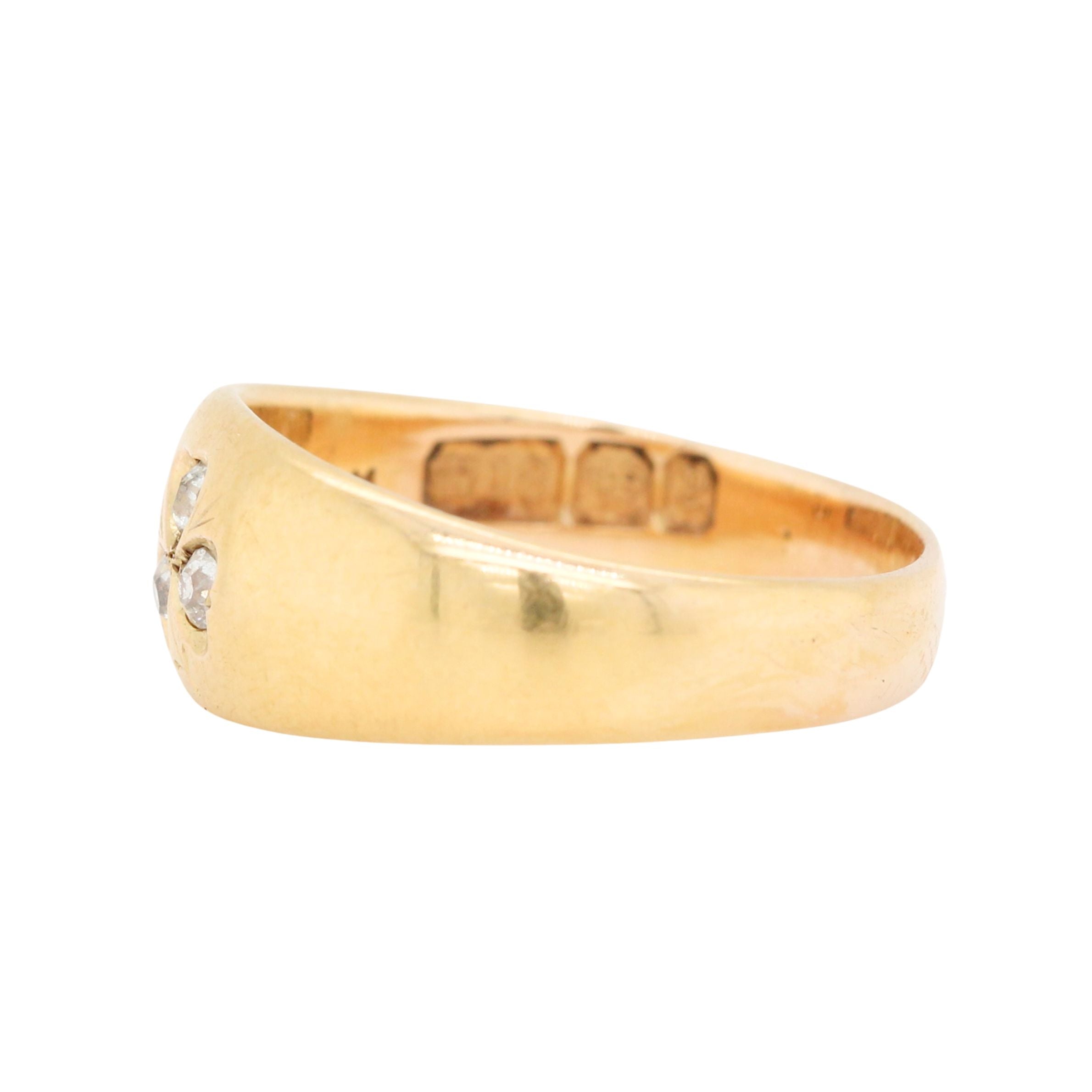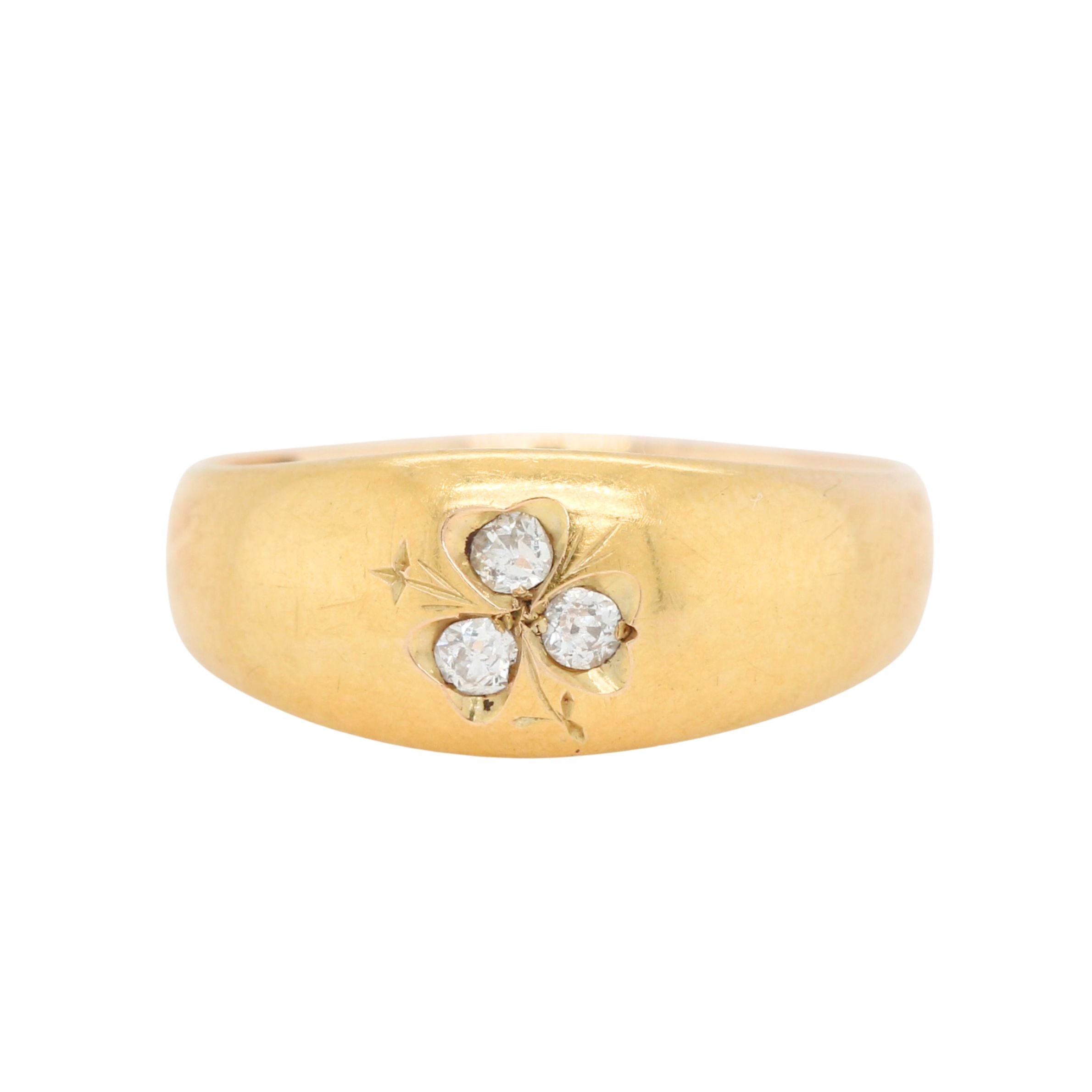 A delightful Victorian 18ct gold shamrock ring featuring three old-cut diamonds set in a simple clover motif, with delicate gold leaves between each petal. The 18ct gold band has a gentle rounded profile, giving it a comfortable, understated elegance. Hallmarked Birmingham 1898