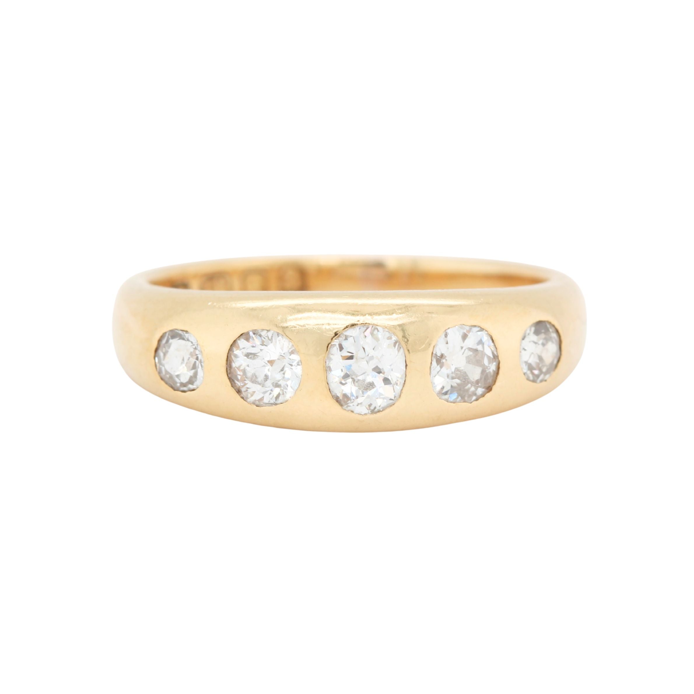 A Victorian five-stone ring set with old mine-cut diamonds, mounted in 18ct gold and hallmarked London, 1869. The diamonds have an estimated total weight of approximately 1.00 carat, assessed as G–H colour with clarity ranging from VS2 to SI1. The ring weighs 8.2 grams and retains clear hallmarks to the inner band.