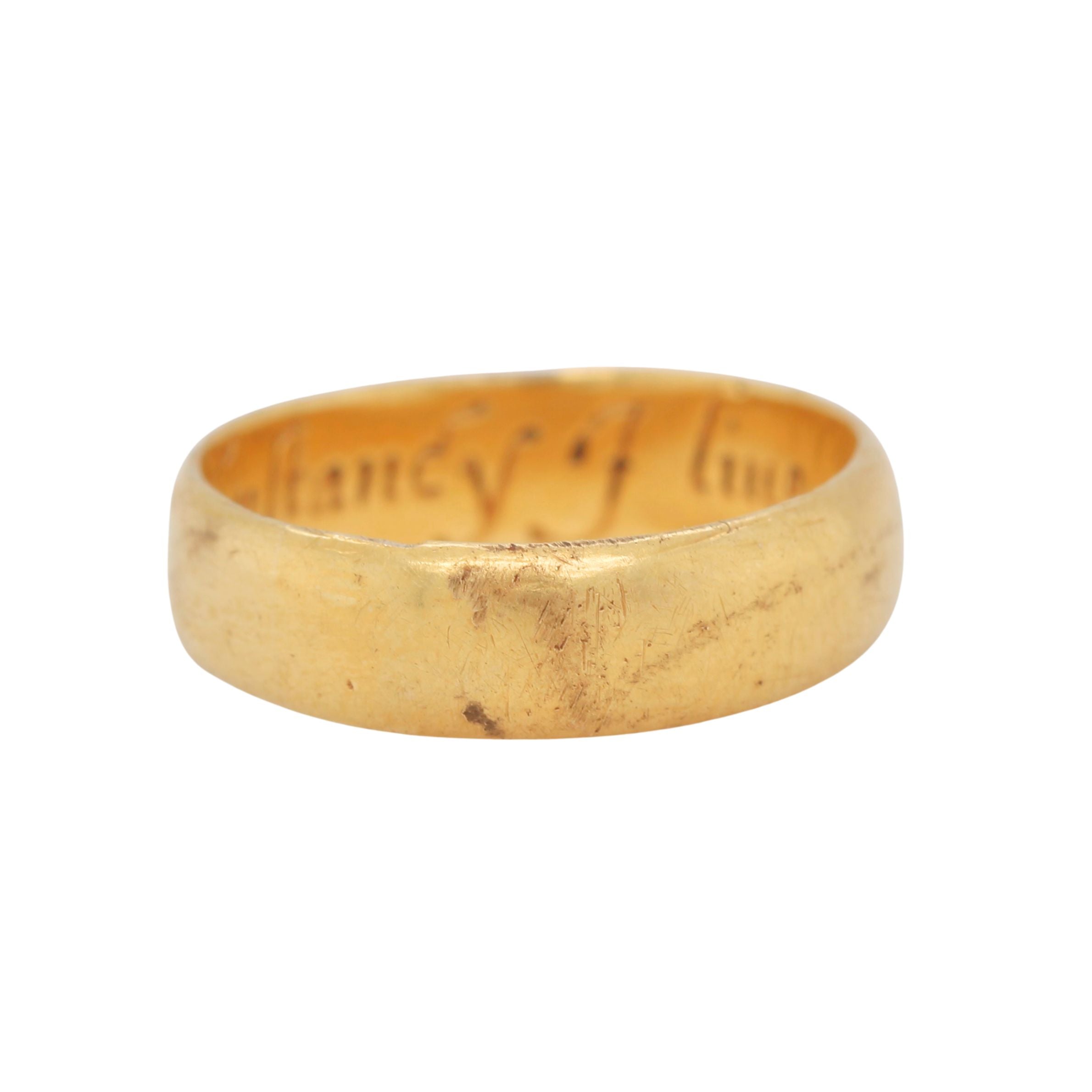 A 17th-century fine gold poesy ring with the inscription "In Conftancy I live and die". Posy rings originate from the French word "poésy" for a motto or verse and were used extensively from the 16th to 18th centuries as lover's tokens and betrothal or wedding rings. This ring was made circa 1680-1700