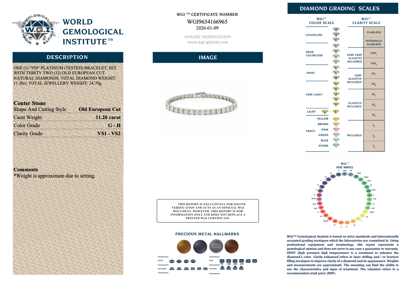 A superb platinum diamond line bracelet dating from circa 1930, set with a striking suite of chunky old European-cut diamonds totalling approximately 11.20 carats. The stones are subtly graduated, ranging from approximately 0.40 carats at the centre to 0.35 carats toward either side, and display pleasing G-H colour with VS1-VS2 clarity throughout. Notably more substantial than the average diamond line bracelet of the period, the piece has exceptional presence on the wrist. It is fitted with an integral clasp and an additional side safety catch for secure wear.