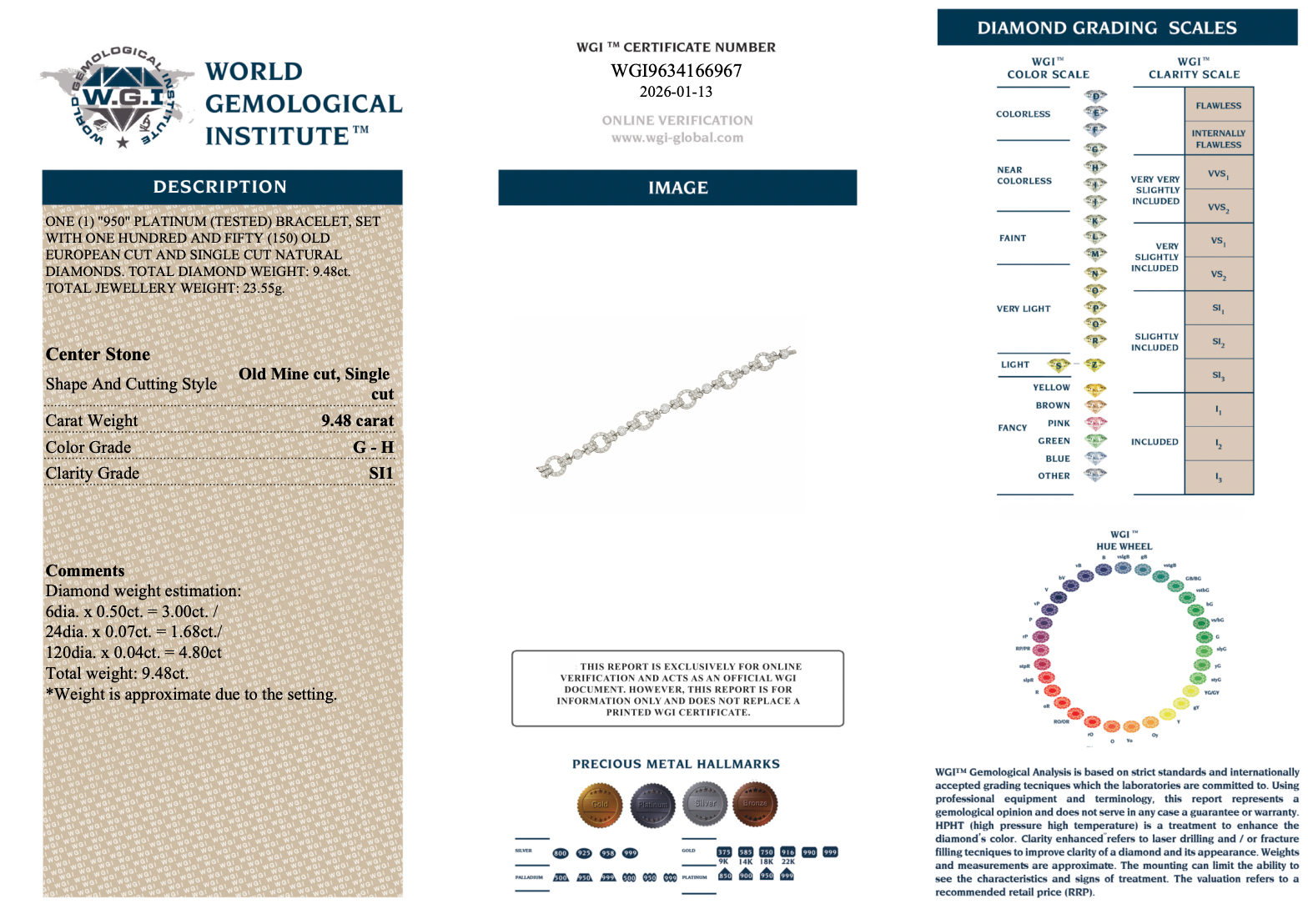 A perfect French platinum bracelet set with Old European cut diamonds, dating to circa 1920. The design features alternating circular links and side bars, each joined by single-set diamonds, all finished with fine millegrain detailing typical of the period. The diamonds total approximately 9.40 carats, with estimated H colour and SI clarity. The bracelet is fitted with a secure clasp and two additional safety catches, one beneath and one to the side of the bracelet. French hallmarks are present, including a dog’s head mark for platinum and a maker’s mark reading ST with a cockerel at the centre and a further T. This is an outstanding piece.