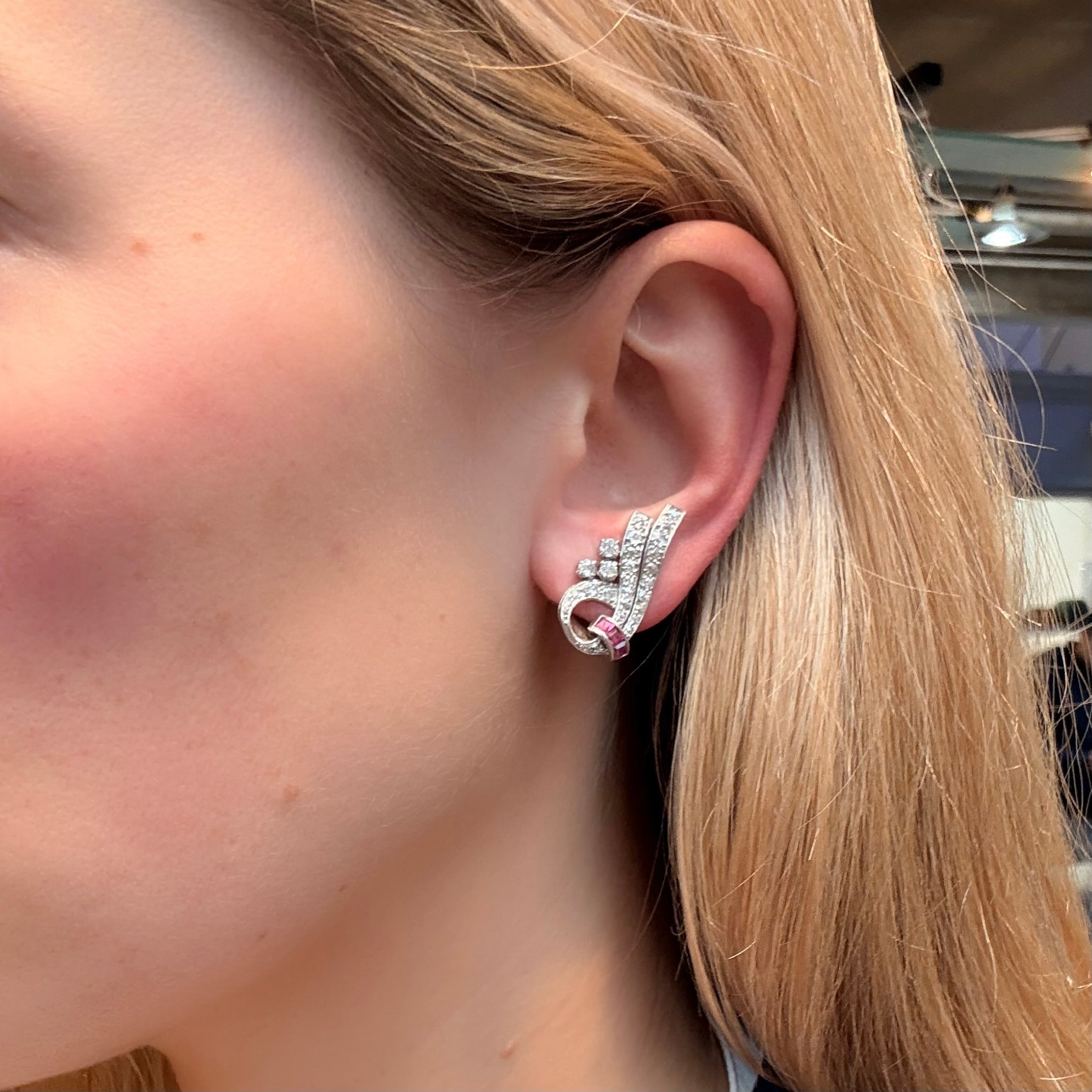 A pair of striking 1920s platinum earrings designed as stylised wings, set with old European-cut diamonds and vivid rubies for a dramatic, sweeping effect. The earrings are set with approximately 2.20 carats of diamonds and around 0.90 carats of Thai rubies, creating a bold contrast of sparkle and colour. Currently fitted with clip fastenings, they could be adapted to include post fittings if desired.