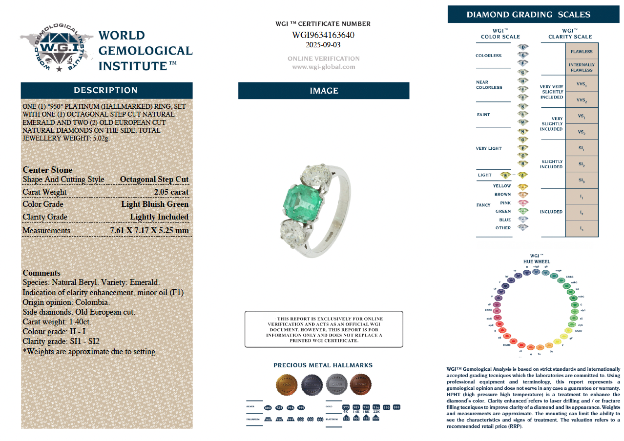 A Columbian emerald and transitional cut diamond three stone ring set in platinum with a 950 mark inside the shank for 95% purity and the hallmark for Sheffield, date letter illegible, circa 1950. The ring has a central octagonal step cut Columbian emerald of approximately 2.05 carats and two surrounding diamonds of approximately 1.40 carats, H-I colour, SI1-SI2 clarity. Fully certified by WGI.