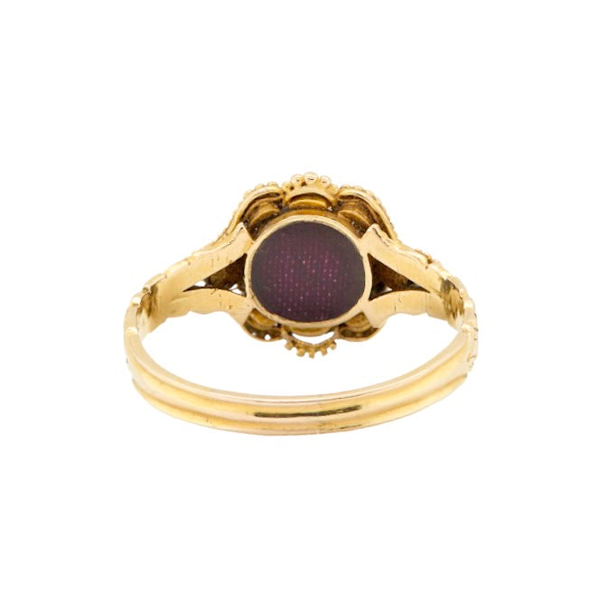 A very pretty Georgian emerald and diamond cluster ring with two rubies on the shoulders. The central step-cut emerald, within a cushion-shaped diamond surround, between step-cut ruby accents to the shoulders, all in foiled closed-back settings, with granulation details throughout. Circa 1810-20.