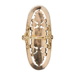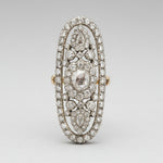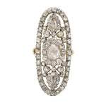 The ring is set with approximately 6.2 carats of rose-cut diamonds, arranged in a dramatic central cluster, highlighted by a larger centre stone of approximately 1.50 carats. Two elegant pointed oval diamond clusters accent either end of the plaque, while a complete surround of shimmering rose diamonds frames the design, enhancing its scale and brilliance.