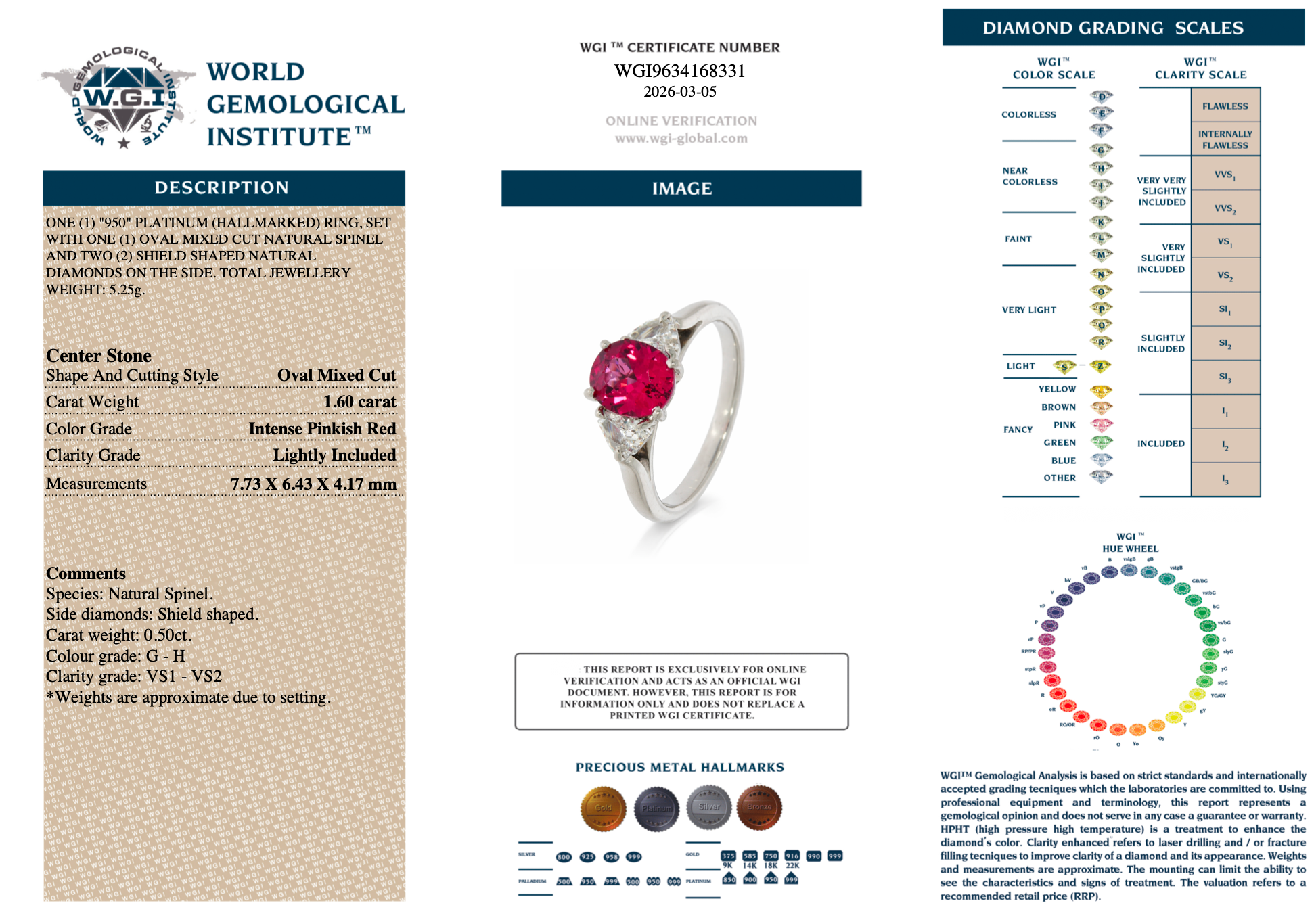 A vintage platinum spinel and trapeze-shaped diamond ring, circa 1990, stamped SDN 950. The ring measures approximately 8mm from north to south and features an oval mixed-cut spinel weighing 1.60 carats, displaying a beautiful intense pinkish-red hue with light natural inclusions. Accentuating the centre stone are trapeze-cut diamonds with a combined weight of approximately 0.50 carats, graded G–H colour and VS1–VS2 clarity. The ring is fully certified by WGI.
